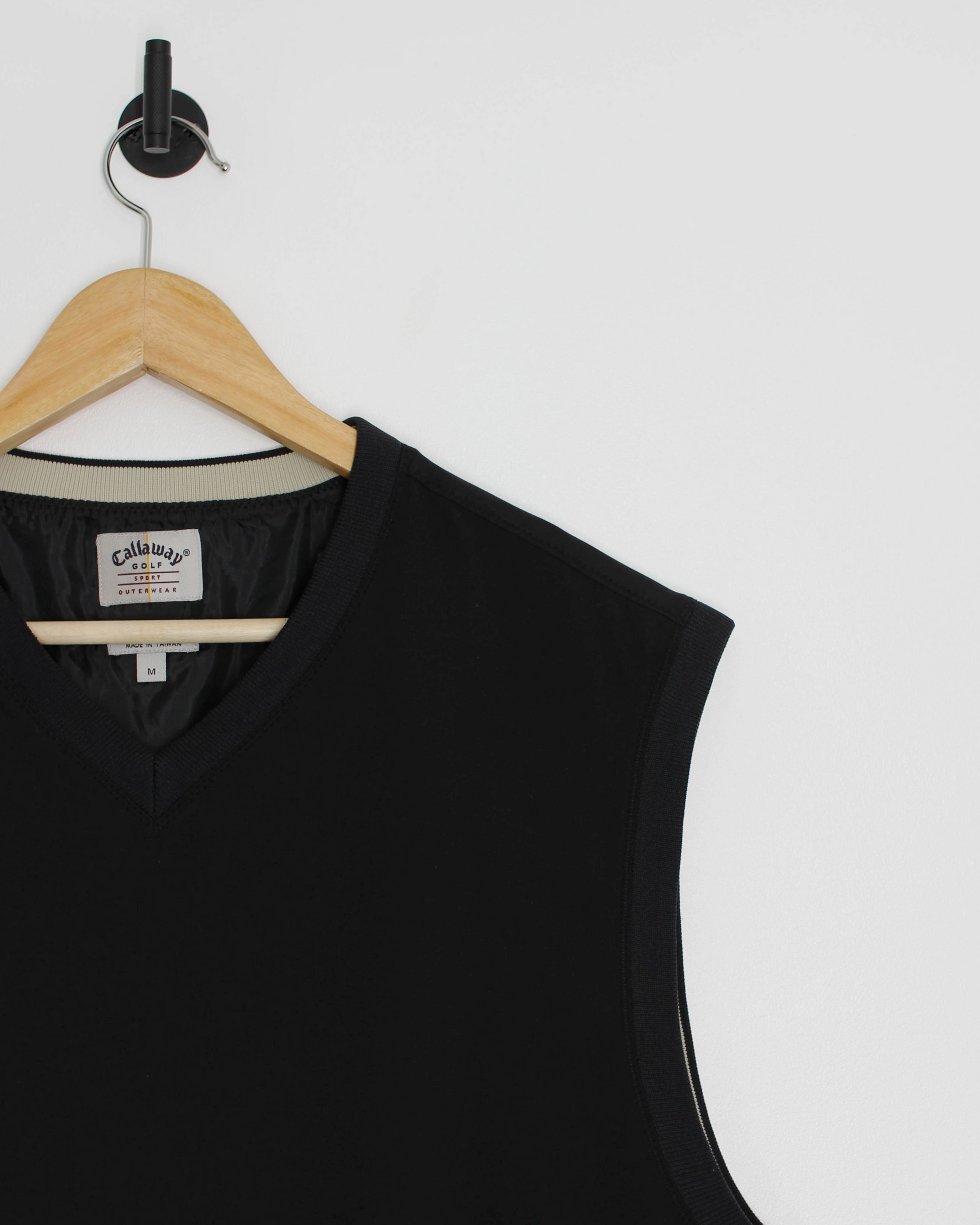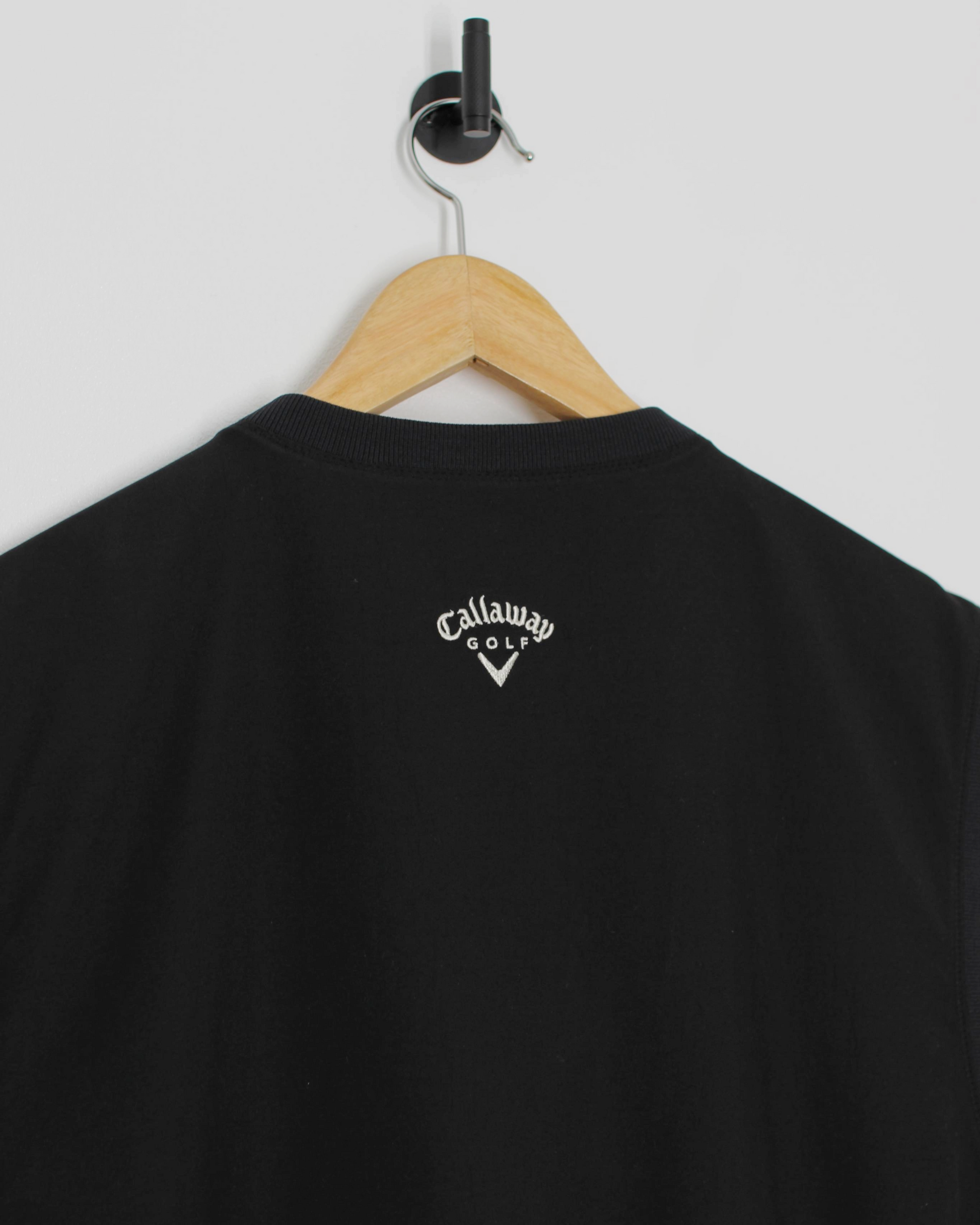 This 00s Callaway Golf vest comes in a clean black finish with a soft matte shell and lightweight lining for comfort and wind resistance. Designed with a V-neckline and ribbed trims, it delivers an easy, tailored shape that layers smoothly over polos or knits. Subtle Callaway embroidery appears on the chest and upper back, adding a minimal branded touch. The elasticated hem provides a secure, flexible fit built for movement through every swing.