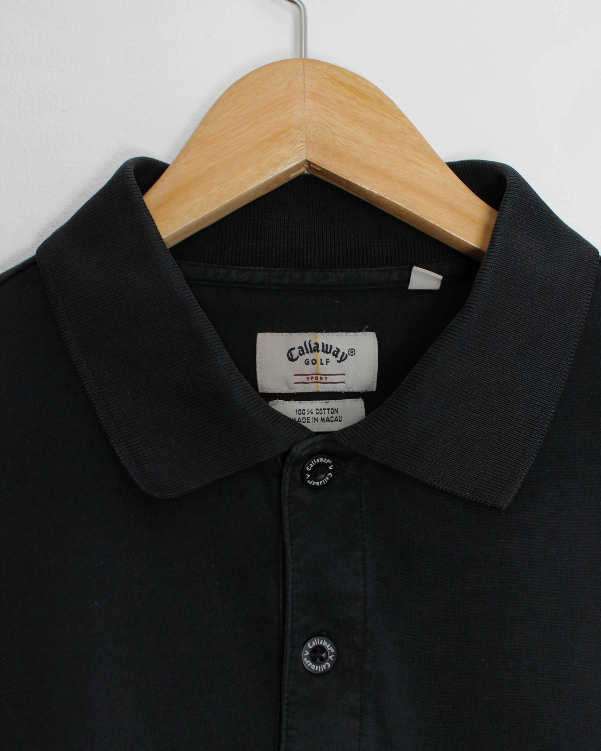 Classic black polo shirt from Callaway Golf featuring tonal embroidered logos at the sleeve and back neck. Made from 100% cotton with a structured collar, branded buttons, and a relaxed early-2000s fit. The midweight fabric has a soft, breathable hand feel that holds its shape through wear, while side vents add movement and comfort. Finished with clean stitching and subtle branding for a timeless, minimal look.
