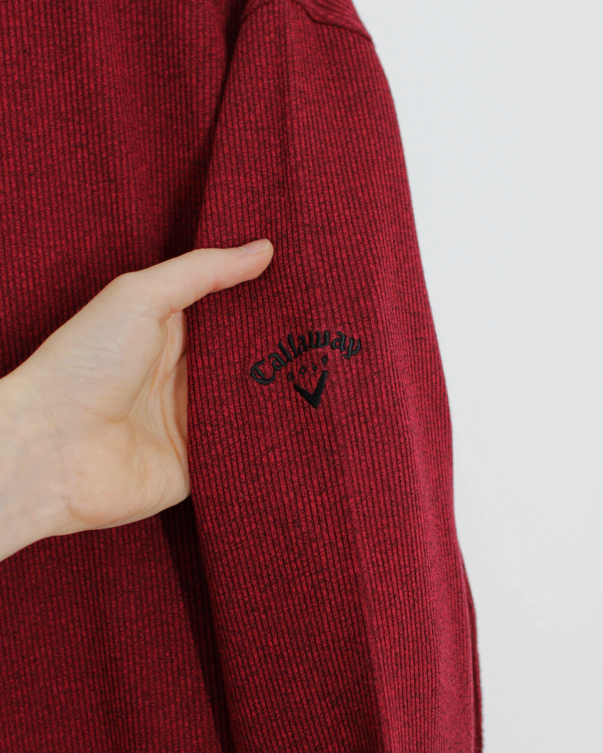 A 00s Callaway red ribbed mock neck, cut from a textured cotton blend that balances comfort with a clean, performance-driven aesthetic. Featuring a subtle ribbed knit throughout, this piece is finished with the Callaway logo embroidered on the sleeve and back for a refined touch. The mock neck design adds warmth and a sleek silhouette, making it a versatile layering option for on and off the course.