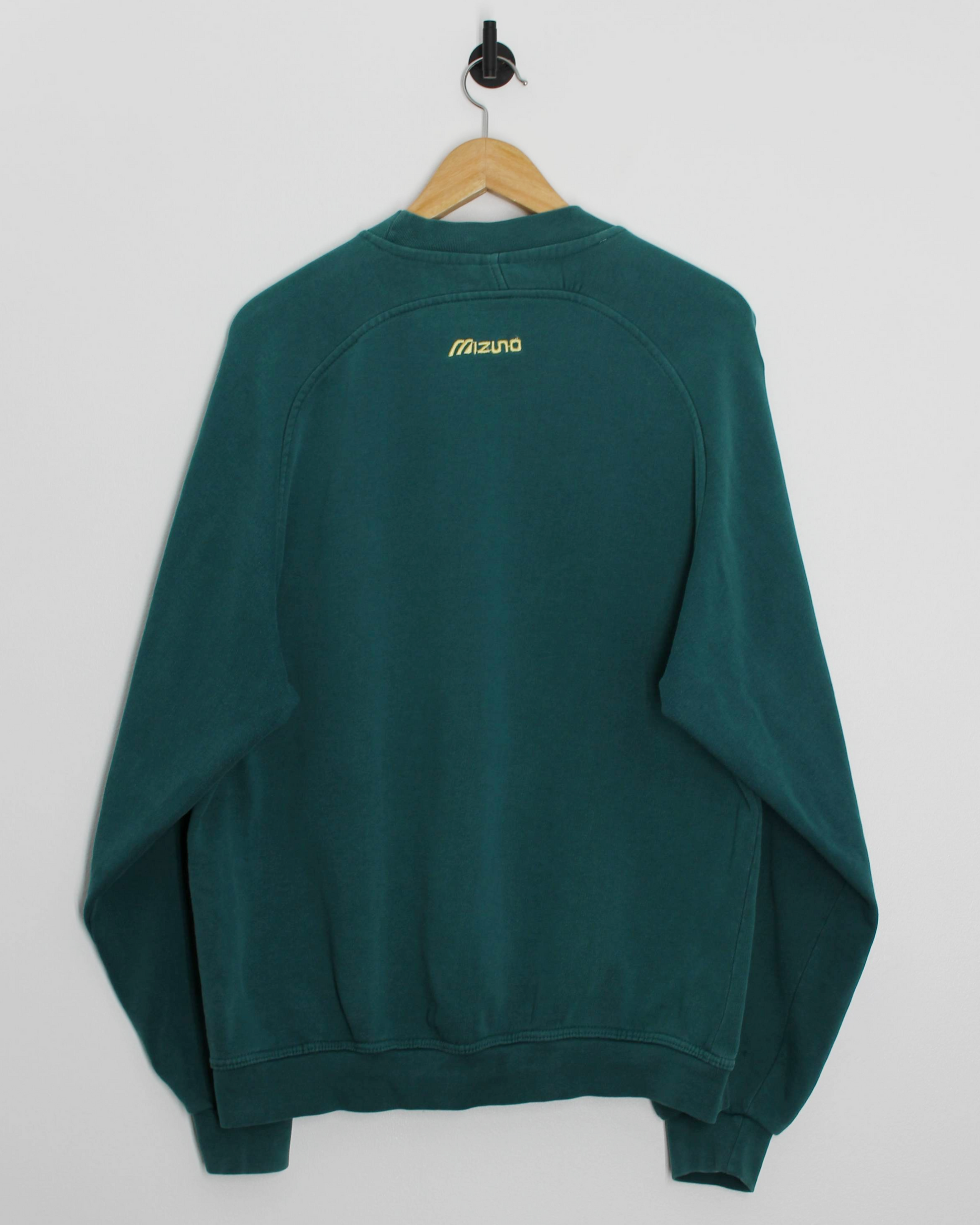 Deep green crewneck sweatshirt from the early 2000s Mizuno line. Mid weight cotton-blend fleece with a soft brushed interior and a structured outer feel. Large embroidered Mizuno logo across the chest in off-white with yellow detailing, finished with a smaller logo hit at the upper back. Raglan sleeves, ribbed cuffs and hem, and a relaxed, slightly boxy fit that sits clean without slouching. Easy to wear and simple to care for.