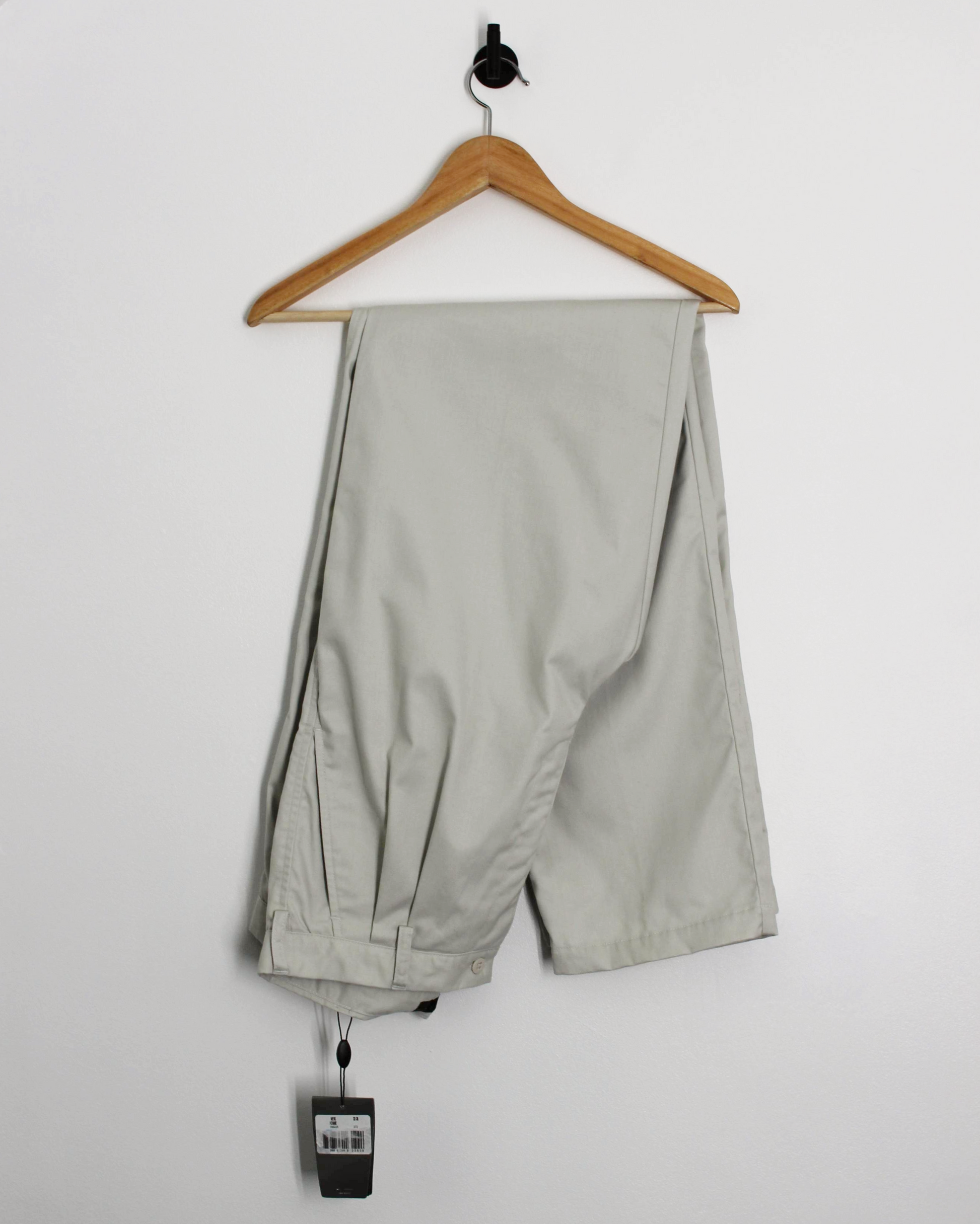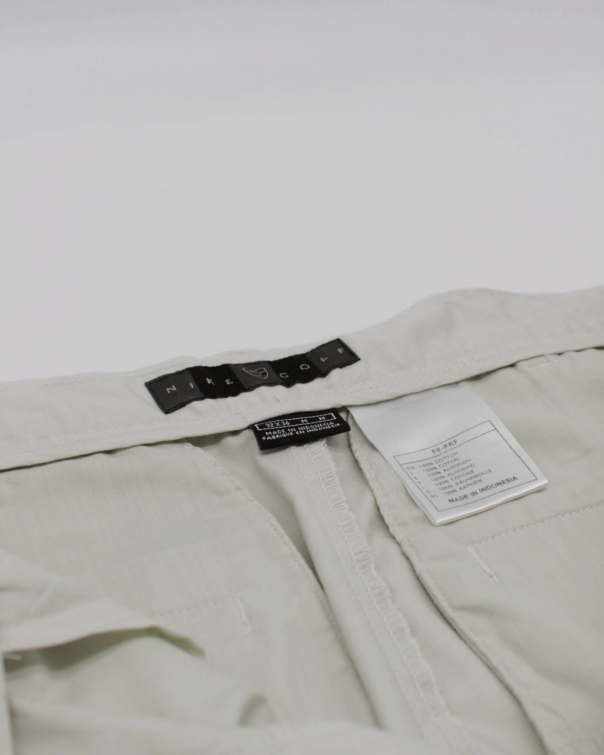 Early-2000s Nike Golf trousers in light beige, cut in a relaxed, baggy fit typical of the era. Made from a soft cotton-nylon blend with a smooth hand feel and slight sheen. Features pleated fronts and side pockets. The waist includes subtle Nike Golf branding, and the piece remains complete with original swing tags - clean, unworn, and ready to wear.