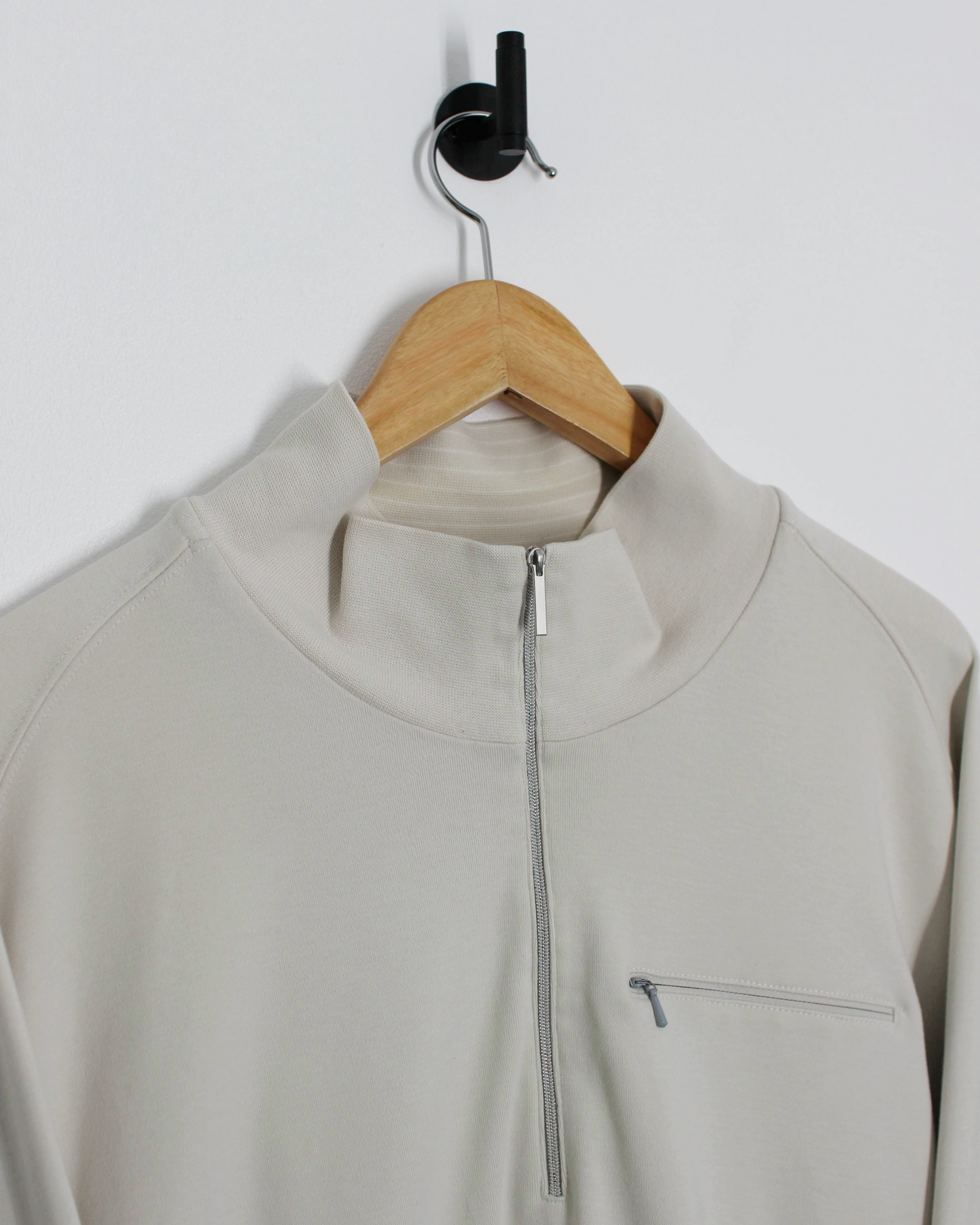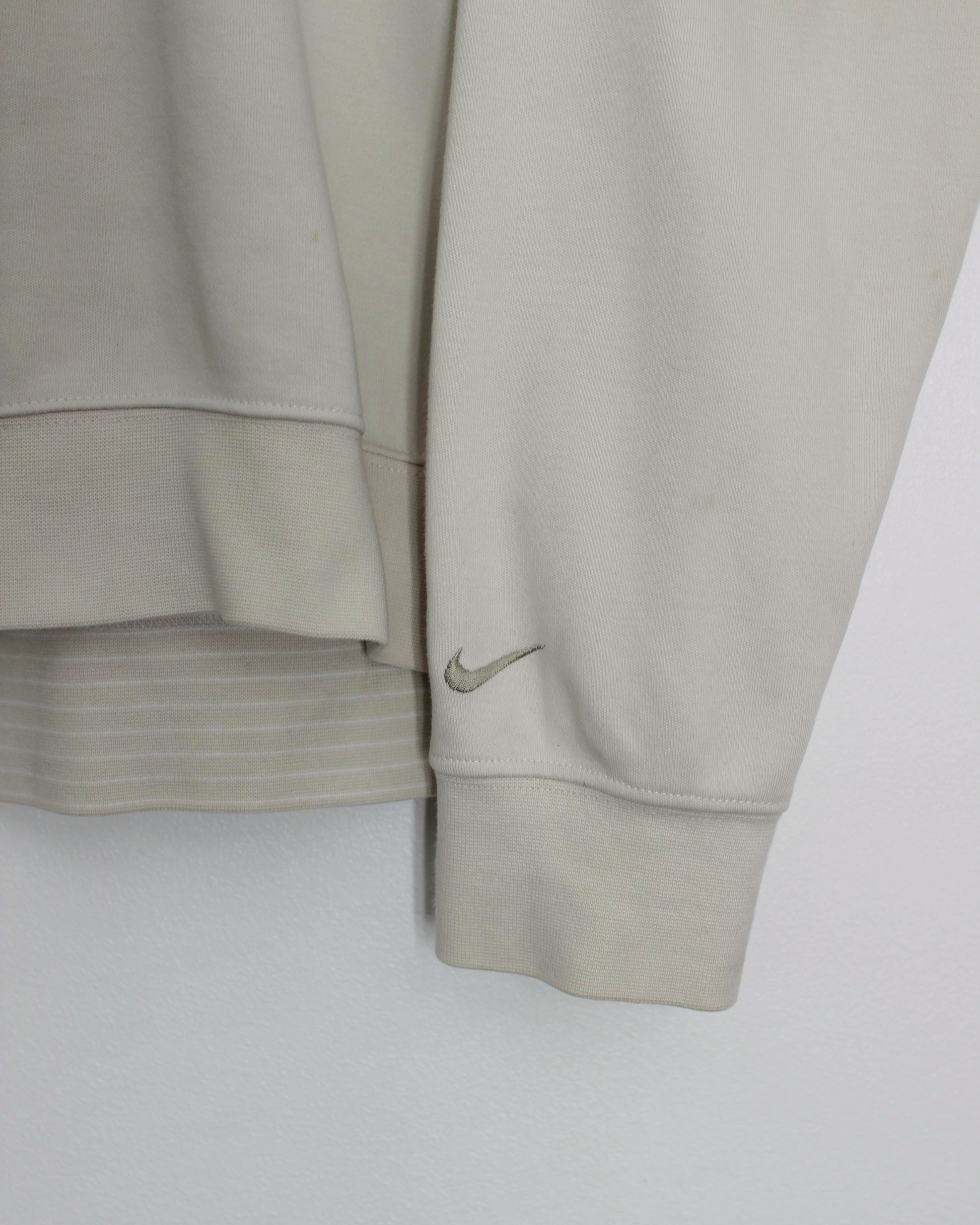 Early-2000s Nike quarter-zip jumper in soft beige, featuring a tonal embroidered Swoosh at the cuff, ribbed stand collar with subtle pinstripe detailing, and a sleek zip chest pocket. The midweight fabric offers a smooth, flexible feel, while the relaxed cut and raglan sleeves provide easy movement on or off the course.