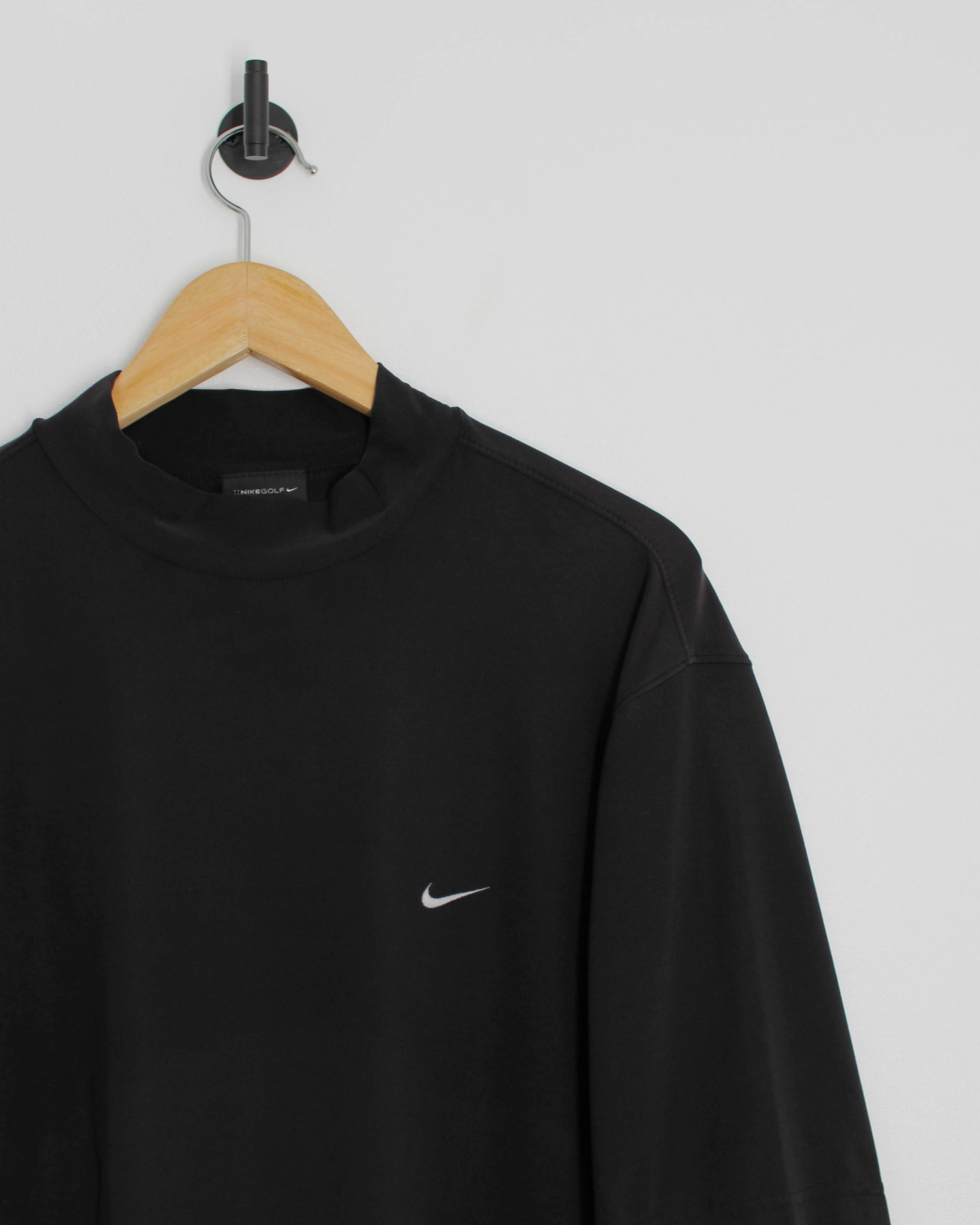 This 00s Nike Golf mock neck comes in solid black with a small white Swoosh embroidered at the chest for a clean, minimal finish. Made from Nike’s Dri-FIT performance fabric, it’s lightweight, breathable, and built for movement. The structured collar gives it a refined edge, while the relaxed cut and slightly extended sleeves add a modern, athletic drape. Simple, functional, and easy to wear year-round.