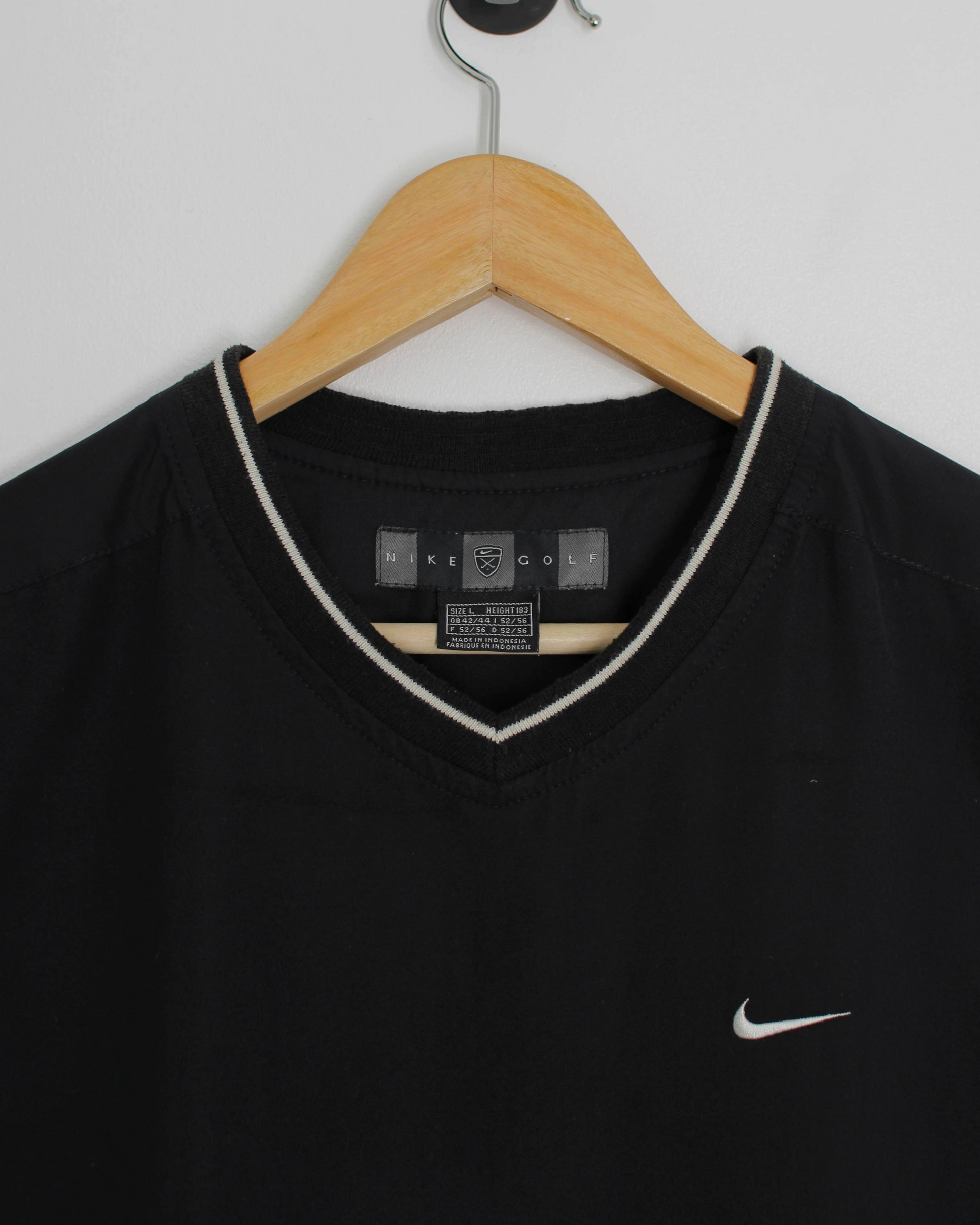 Black sleeveless golf vest with contrast white piping along the V-neck, armholes, and collar for a sharp, minimal finish. Constructed from a smooth nylon-blend shell with a subtle sheen and a comfortable inner lining for light insulation. Features a small embroidered Swoosh at the chest and Nike Golf crest below the back collar. The relaxed fit and elasticated hem create a clean, athletic silhouette ideal for layering over polos.