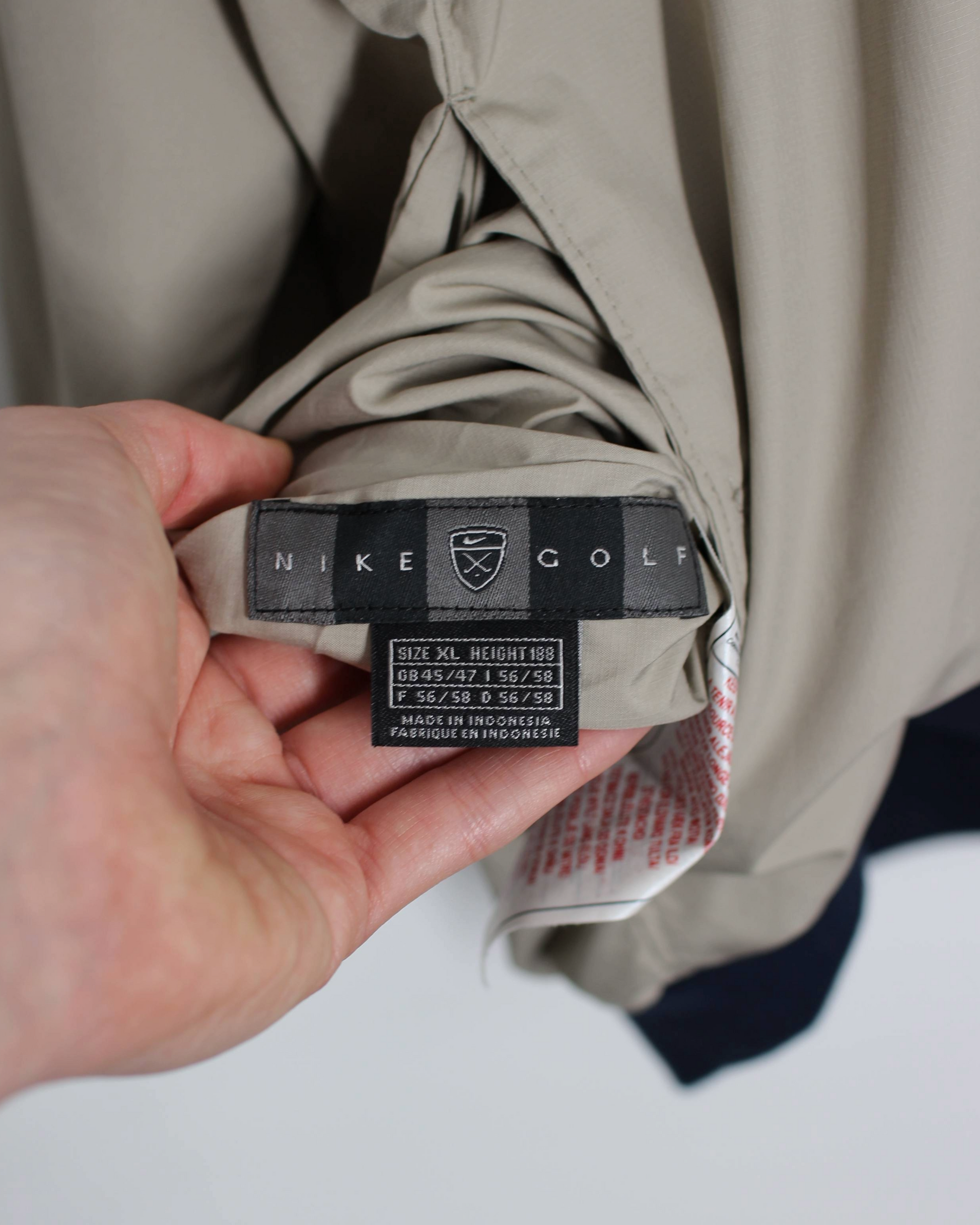 Finished in a deep navy on one side and a clean cream on the reverse, this 00s Nike V-neck jumper brings two looks in one with a relaxed, easy-wear fit. The navy side features a ribbed knit texture and a small Swoosh at the chest, while the cream windbreaker side offers a smooth, lightweight finish with elastic hem and cuffs. A tonal Nike Golf crest lines the neckline on both sides, giving the piece a unified identity no matter how it's worn.