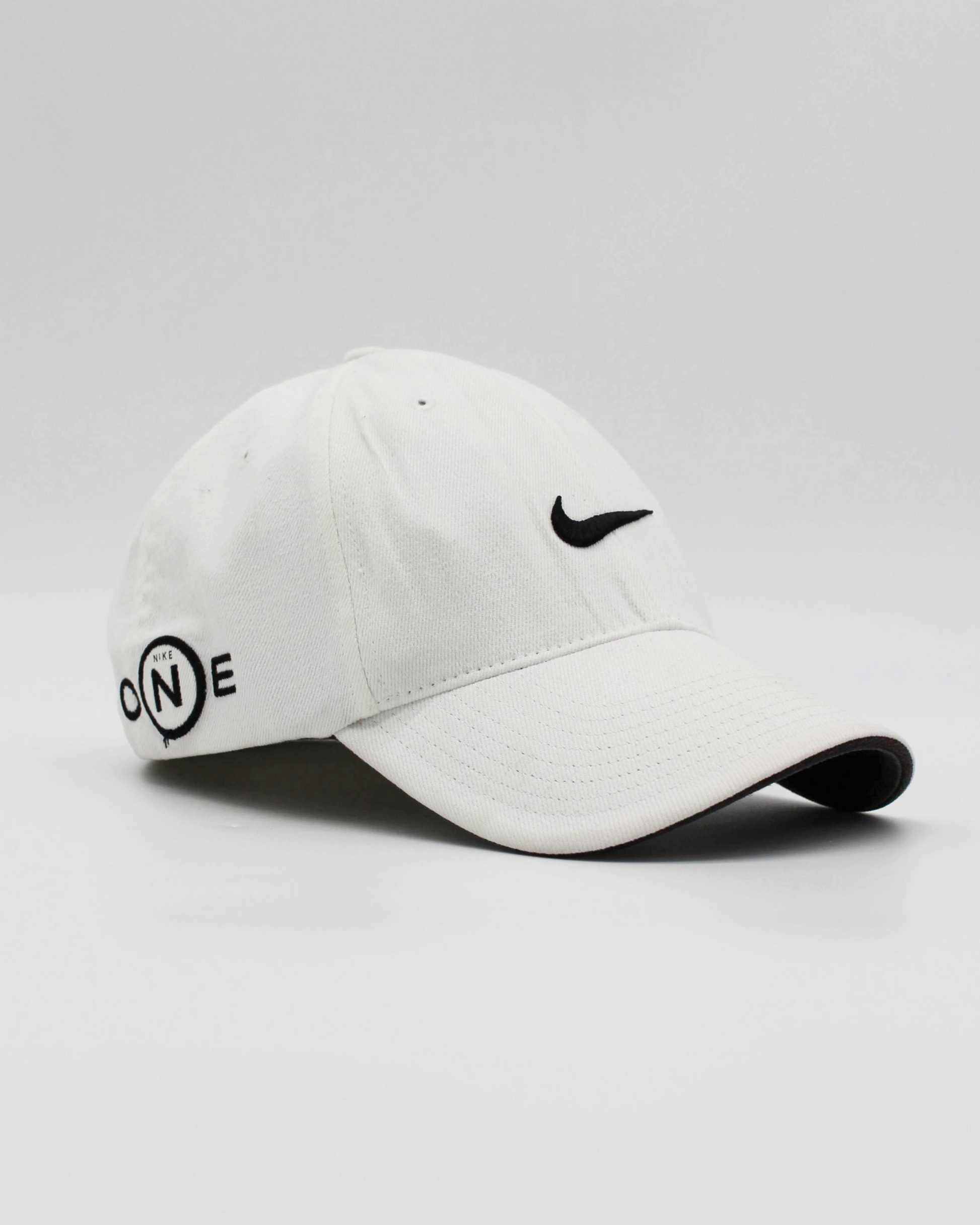 Finished in a clean white cotton build, this early-2000s Nike Golf cap features a relaxed six-panel design with a pre-curved brim and tonal stitching. Embroidered black branding details appear throughout, with the Swoosh at the front, a bold “ONE” logo at the side referencing Nike’s signature ball, and “SQ” at the opposite panel. A smaller Swoosh at the back completes the look. Inside, a black sweatband provides comfort and durability for on-course wear.