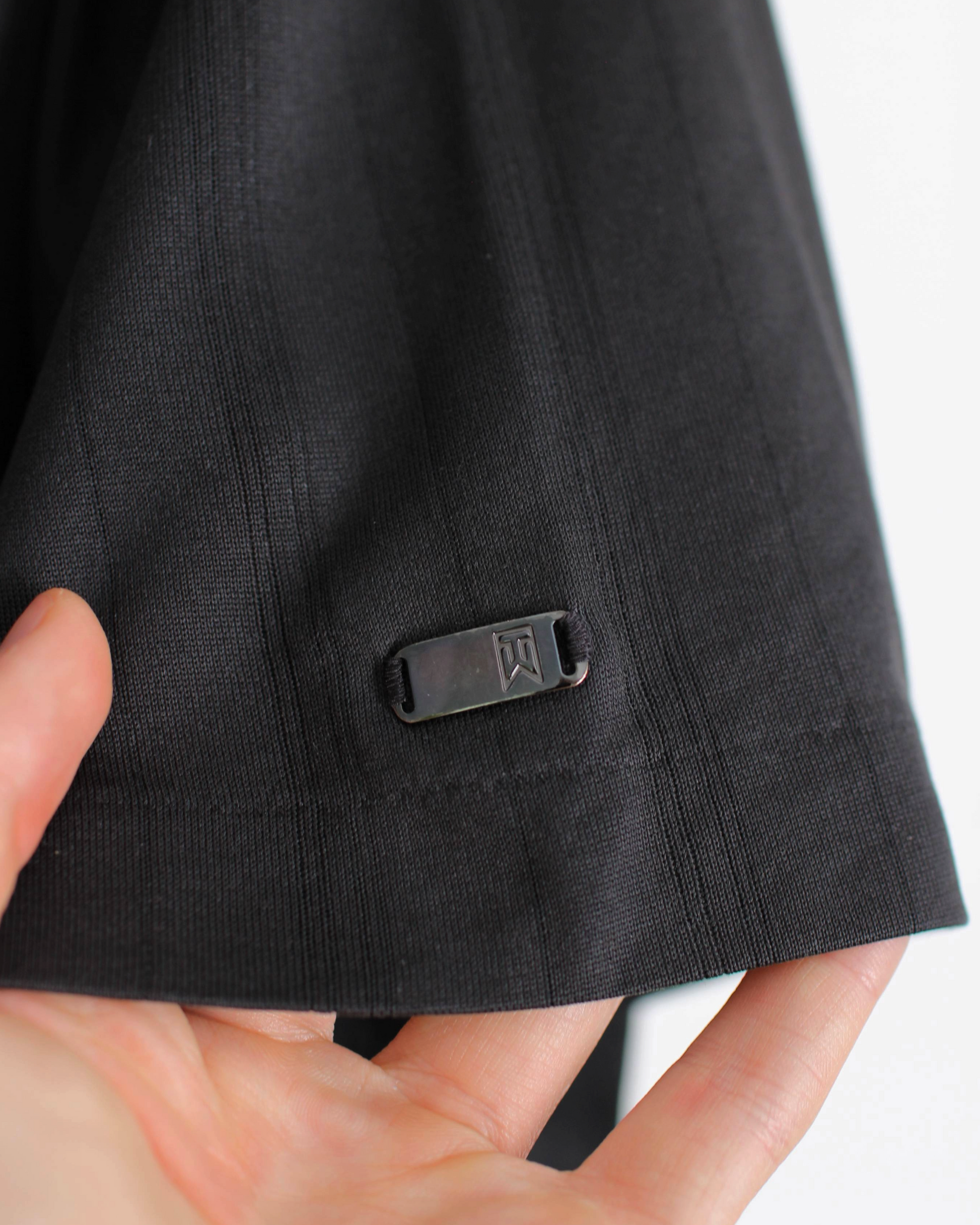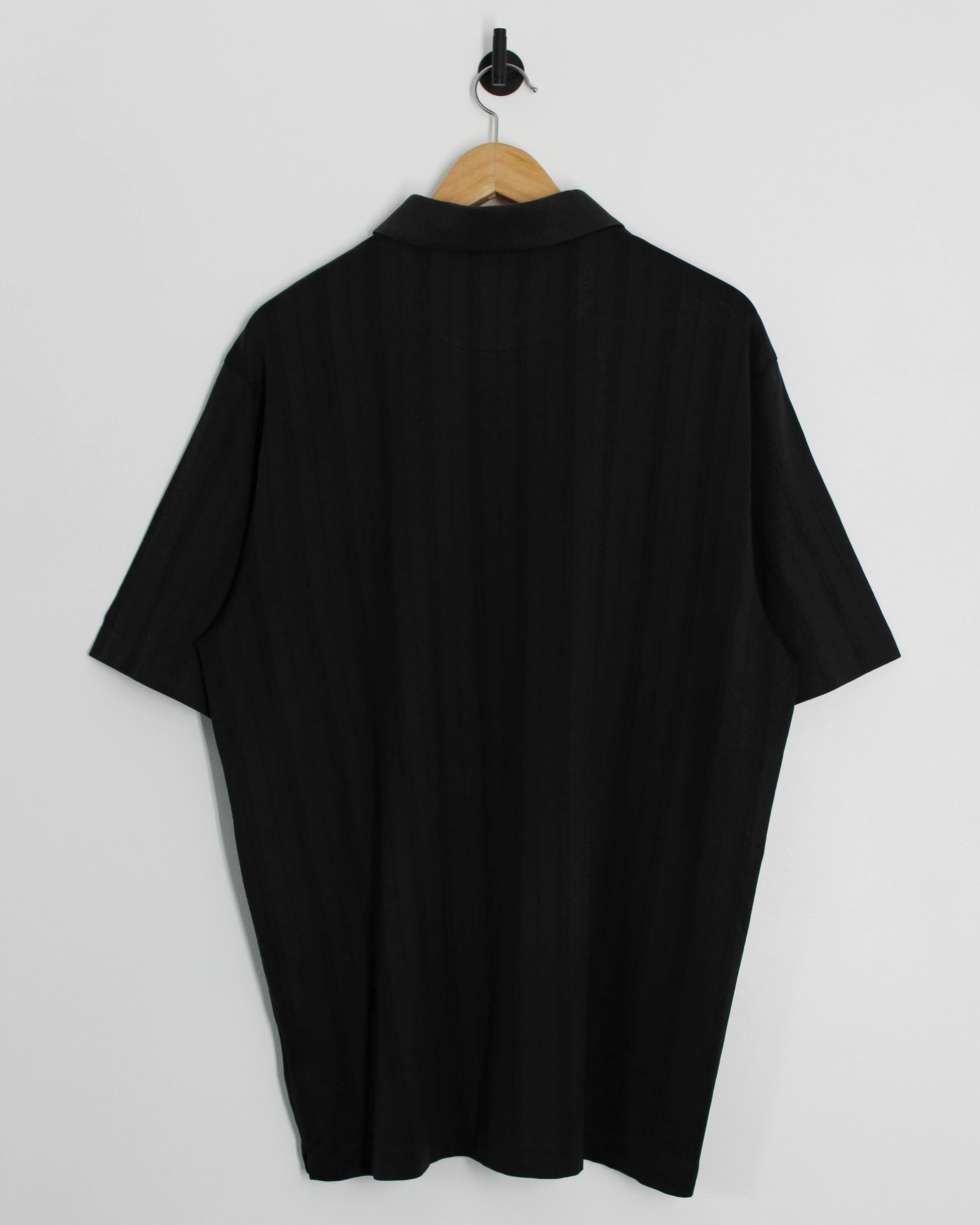 Early 2000s Nike Tiger Woods polo in deep black with tonal vertical striping and a minimalist silhouette. Features a structured collar, three-button placket, and subtle silver Swoosh embroidery at the chest. The sleeve is finished with a small black metal TW emblem, adding a refined detail. Cut from Nike’s signature performance fabric for breathability and stretch, it’s designed for movement with a clean, athletic drape that feels modern and understated.