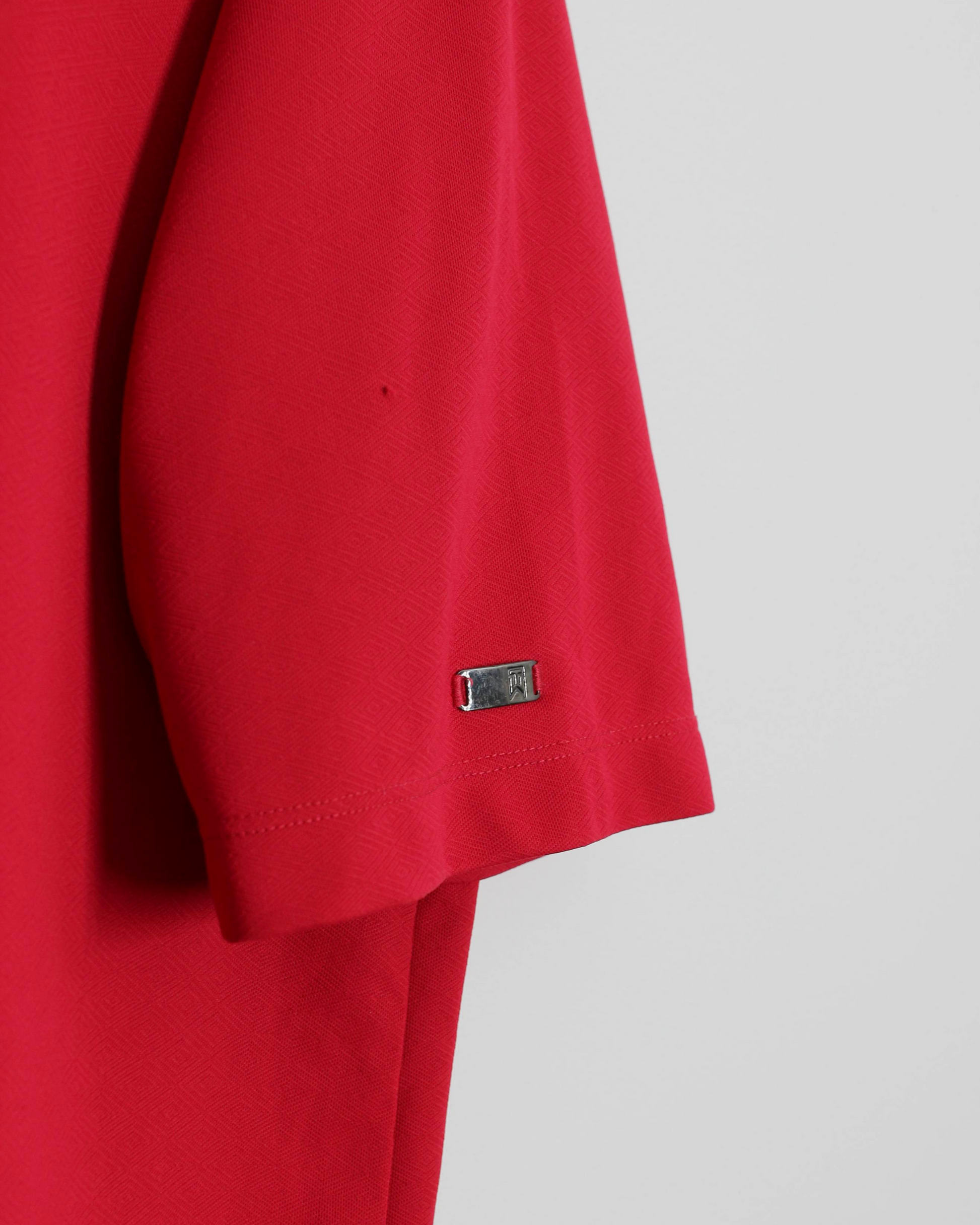 Deep red short-sleeve mock neck golf top from the early 2000s Nike Tiger Woods line. Clean front with a small black Swoosh at chest and subtle metal Tiger Woods tag at the sleeve. Lightweight performance fabric with a smooth, structured feel, designed to hold shape without feeling stiff. Relaxed, slightly boxy fit through the body with a straight hem and minimal stretch. Easy-care and built for warm rounds or layering.