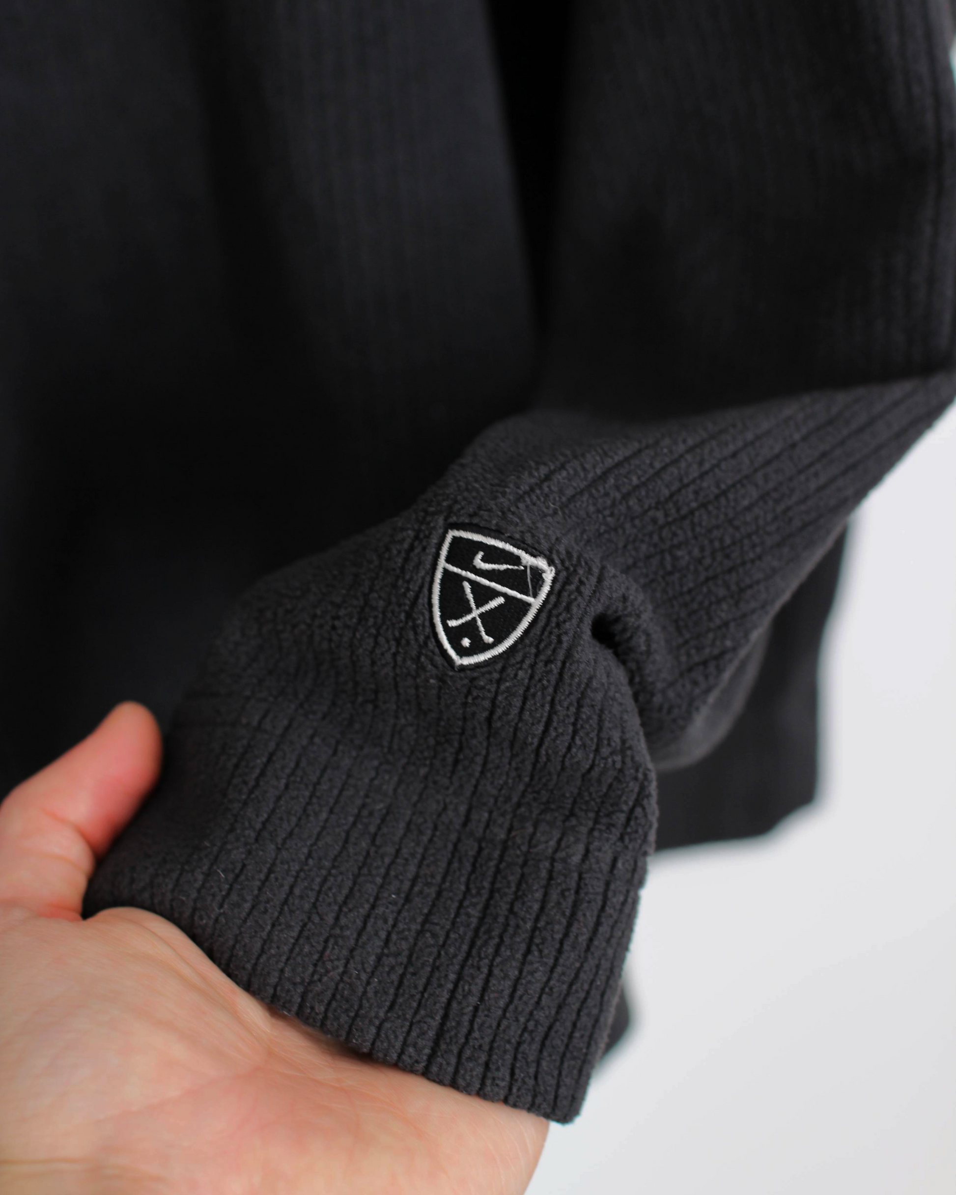 Black ribbed V-neck sweatshirt from the early 2000s Nike Tiger Woods collection. Made from a midweight cotton blend with a subtle vertical texture that gives structure and movement. Finished with tonal ribbing at the neckline, cuffs, and hem, and a small Nike Golf shield logo embroidered on the sleeve. Designed in a relaxed XL fit for comfort and easy layering on or off the course.