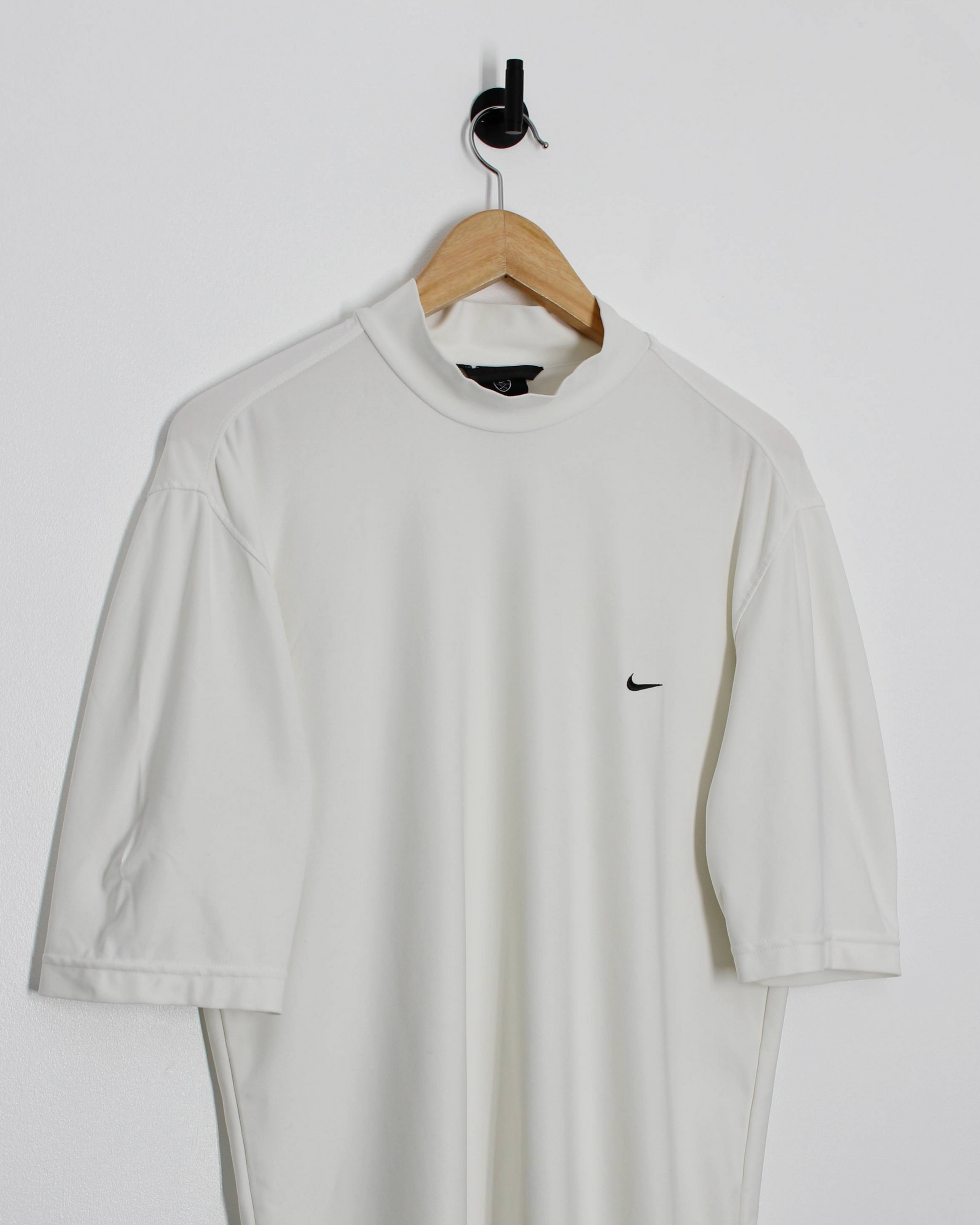 Soft white Nike mock neck top from the early 2000s, finished with a small black Swoosh at the chest. Lightweight performance fabric with a smooth, slightly stretchy feel designed for movement and breathability. Short sleeves and a relaxed, straight fit give it an easy drape without feeling oversized. Clean mock neck collar adds structure while keeping the look minimal. Easy-care and built for regular wear.