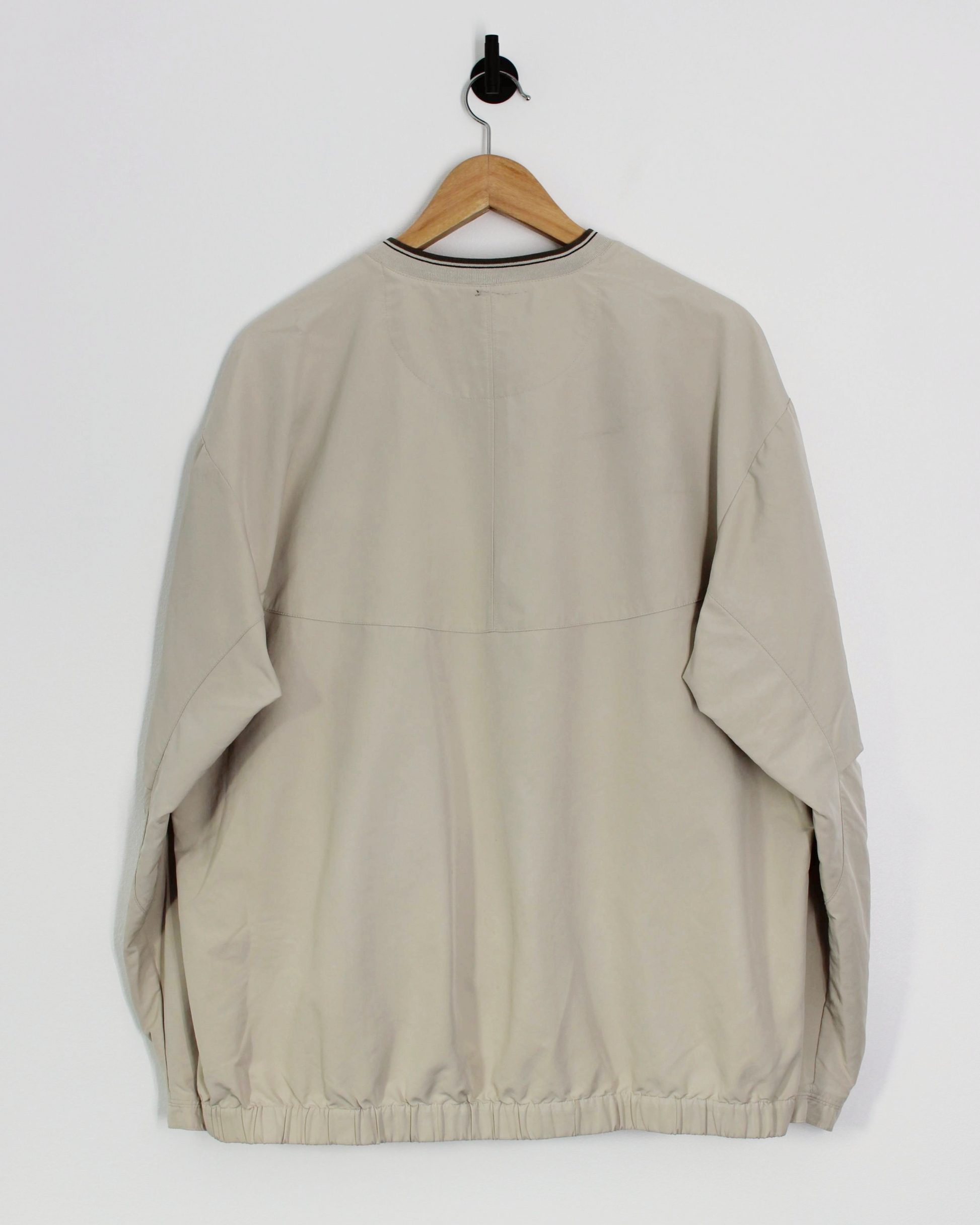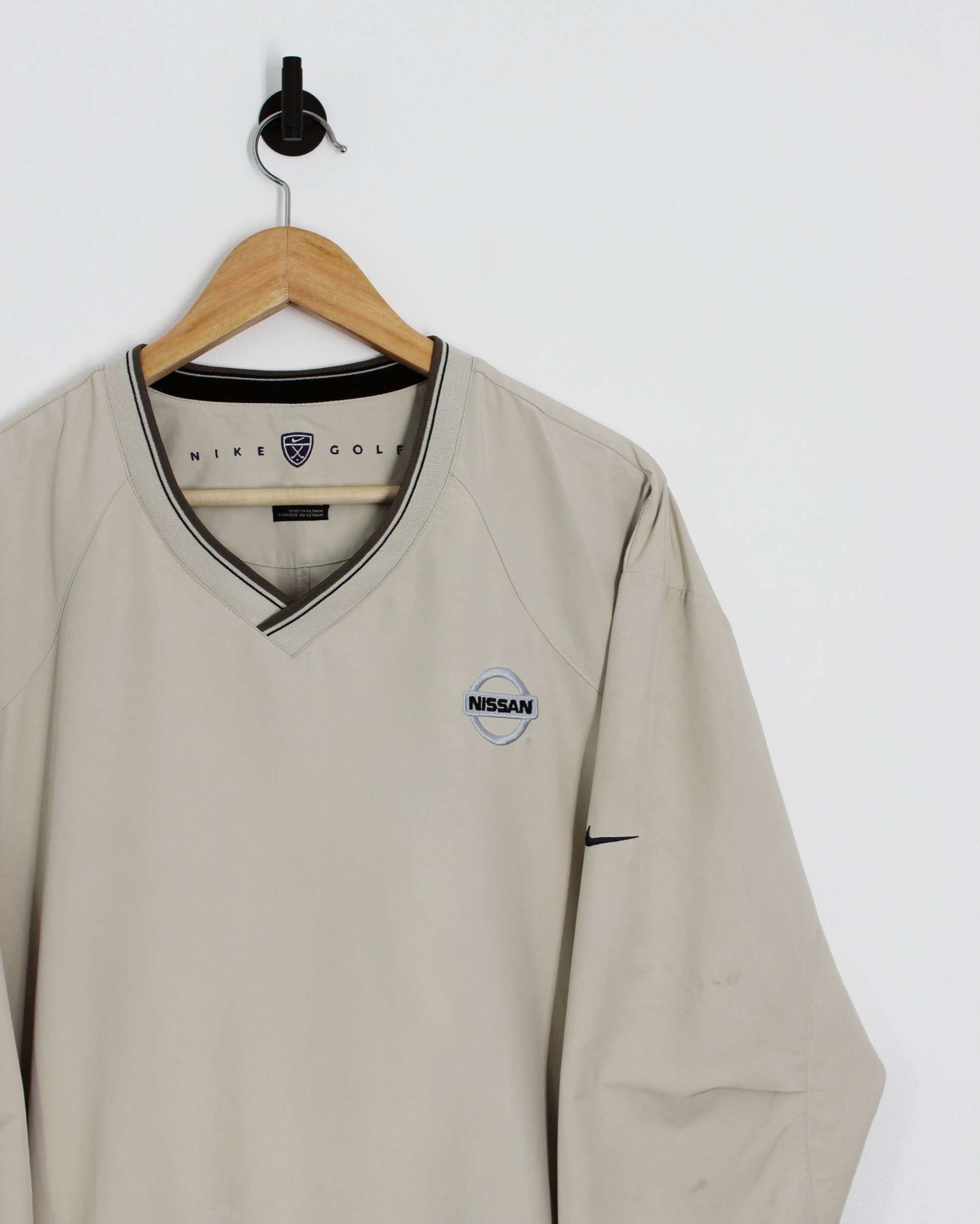 A beige Nike Golf windbreaker from the early 2000s featuring a relaxed, easy drape and classic V-neck cut. Made from lightweight, weather-resistant nylon with elastic cuffs and hem for a secure fit. The front chest carries an embroidered Nissan logo, balanced by a small black Swoosh on the sleeve. Minimalist striping along the collar and cuffs adds subtle contrast, keeping the look refined yet functional.