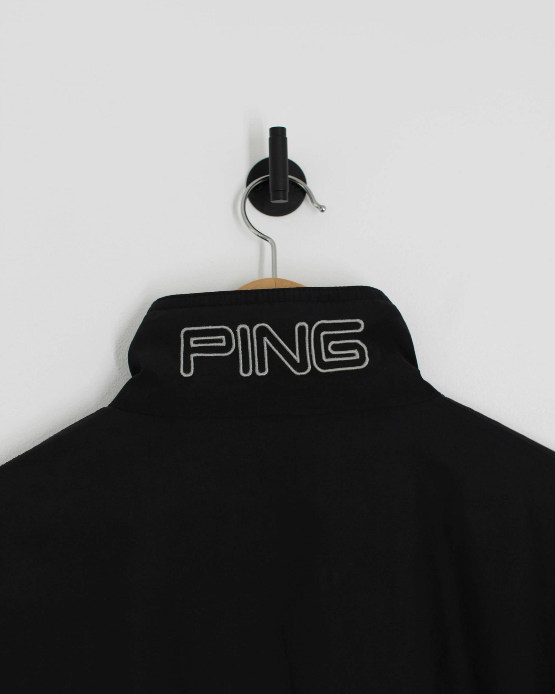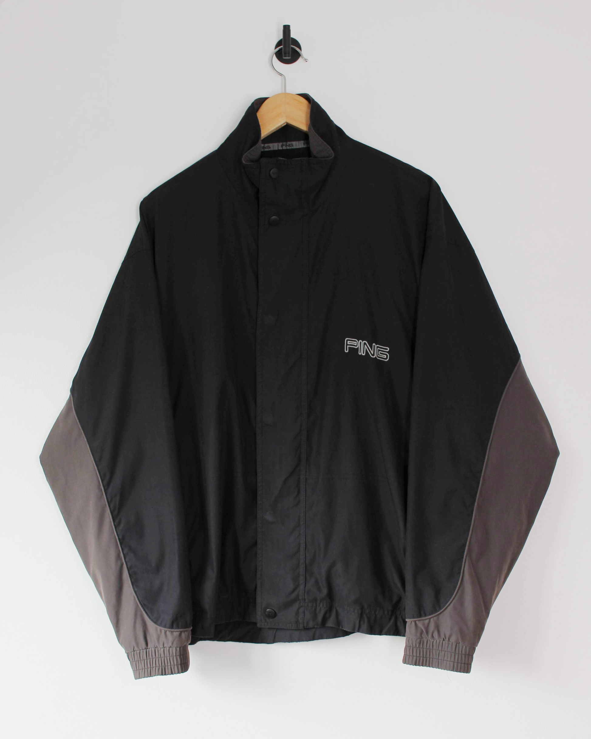 A 00s Ping full-zip jacket in black with contrast dark grey panels running along the sleeves. The front features an embroidered Ping logo at the chest and a covered zip with snap button closure for a clean finish. The back collar carries oversized Ping branding, adding a bold touch to the otherwise minimal design. Elastic cuffs and an adjustable hem provide a secure fit, while the lightweight shell makes it a versatile outer layer for shifting conditions.