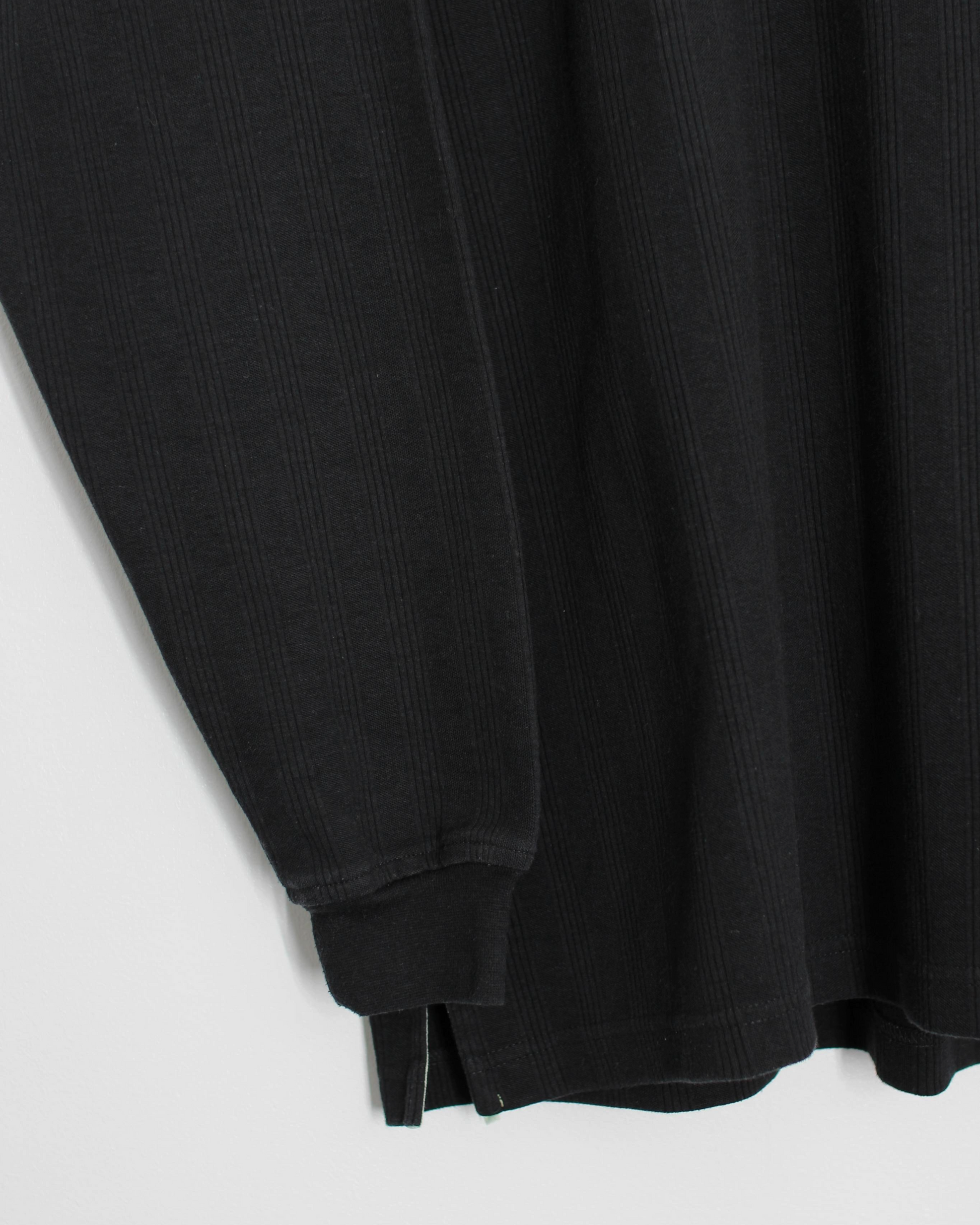 Early-2000s PING long-sleeve polo in black, detailed with light grey contrast piping along the collar and placket. The tonal embroidered PING logo at the chest adds a clean finish, while ribbed cuffs and side vents at the hem ensure comfort and movement. Made from a subtly textured fabric that feels structured yet easy, this piece bridges function and understated style.