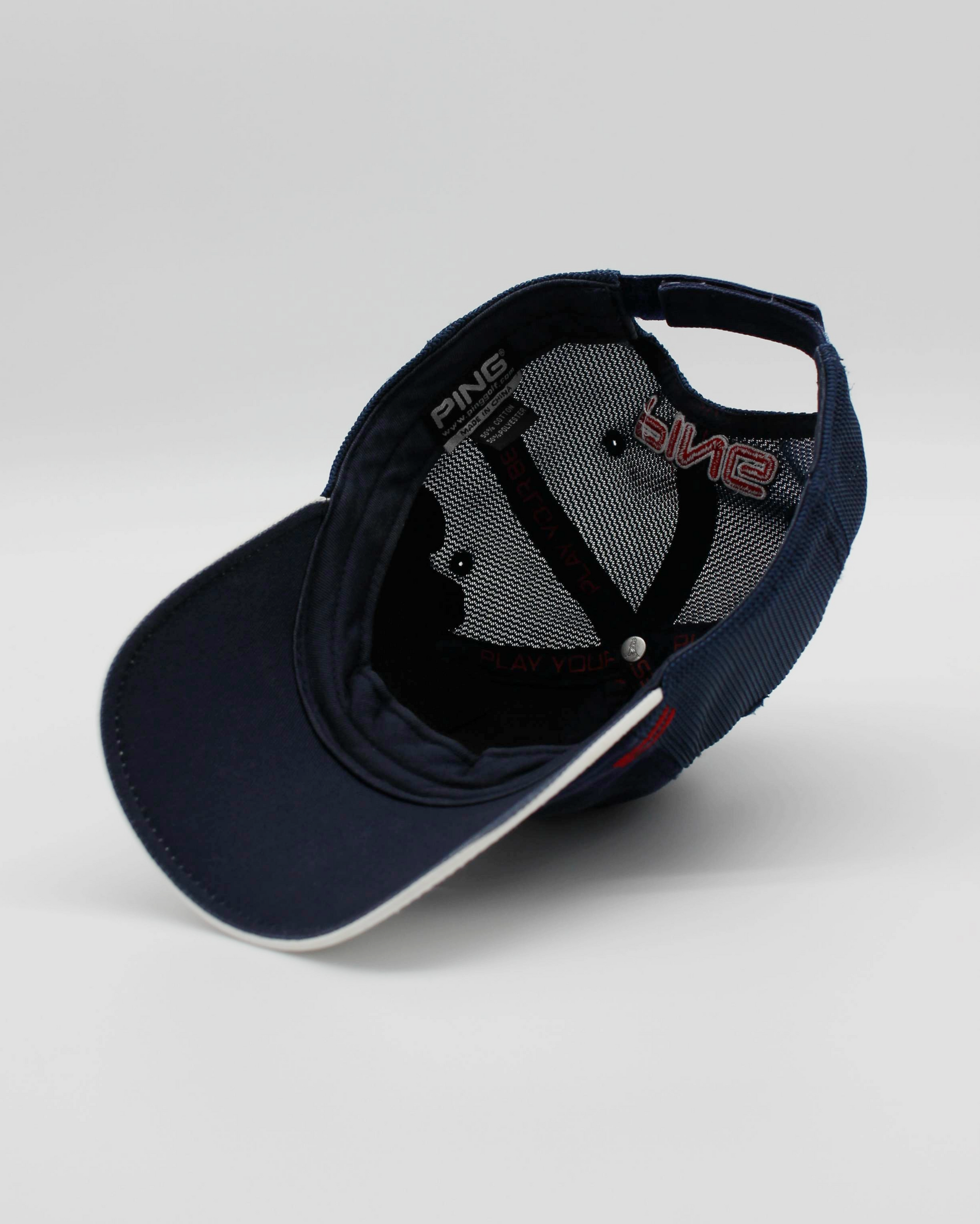 A navy mesh-back cap with the classic red and white “Ping Man” logo embroidered on the front and matching PING branding at the brim and rear. Built with a structured front panel and breathable mesh sides, it features a white curved brim with contrast piping and a Velcro strap closure. Fits slightly small with a slimmer crown shape, giving it a sleek, tailored look that sits close without bulk.