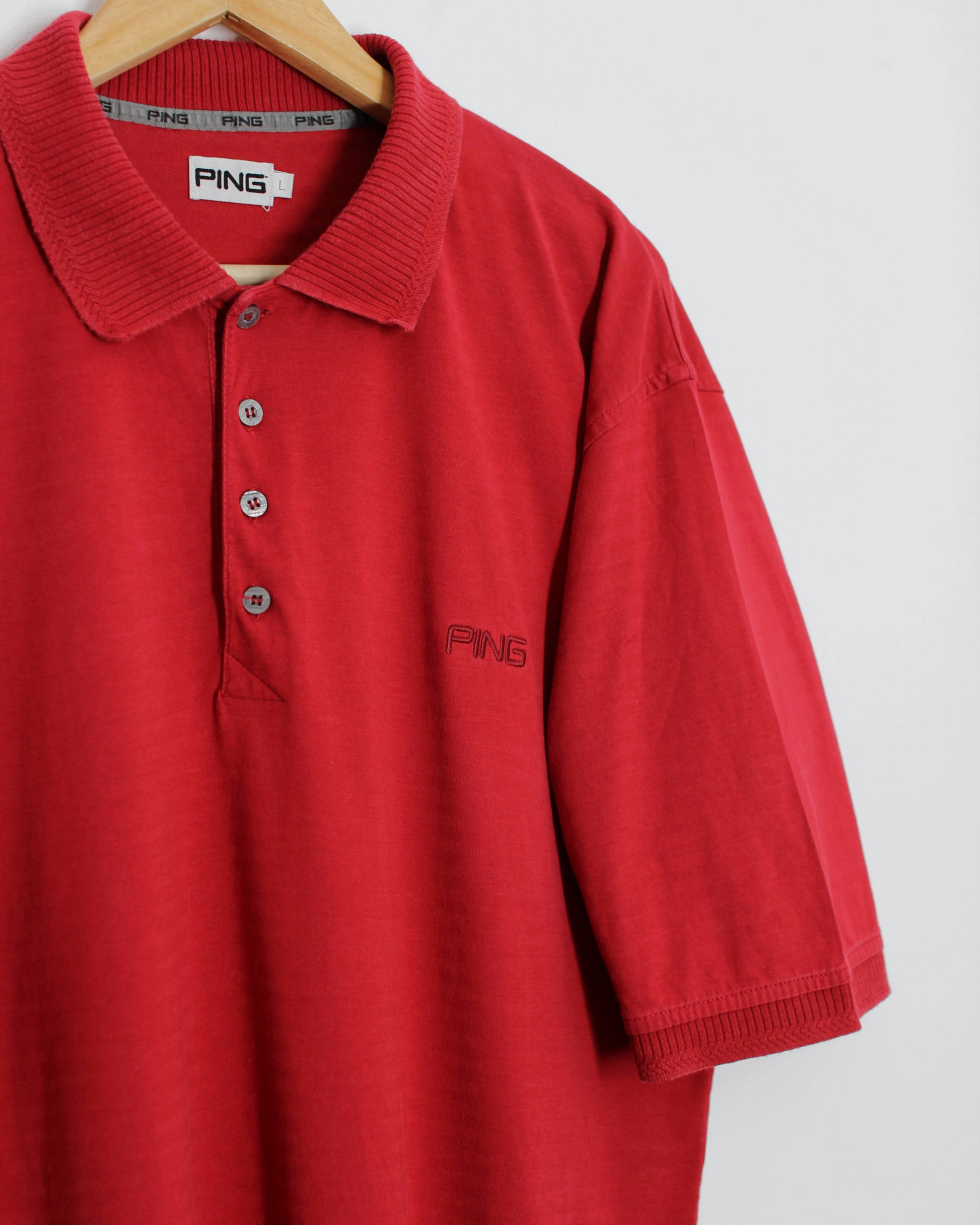 Deep red Ping polo from the early 2000s, made from a soft cotton jersey with a relaxed, slightly boxy fit. Features a ribbed collar, three-button placket with tonal buttons, and ribbed sleeve cuffs for subtle structure. Embroidered Ping logo sits clean on the chest, with branded taping inside the neckline. Easy drape through the body, designed for comfort on and off the course. Machine washable and built for regular wear.