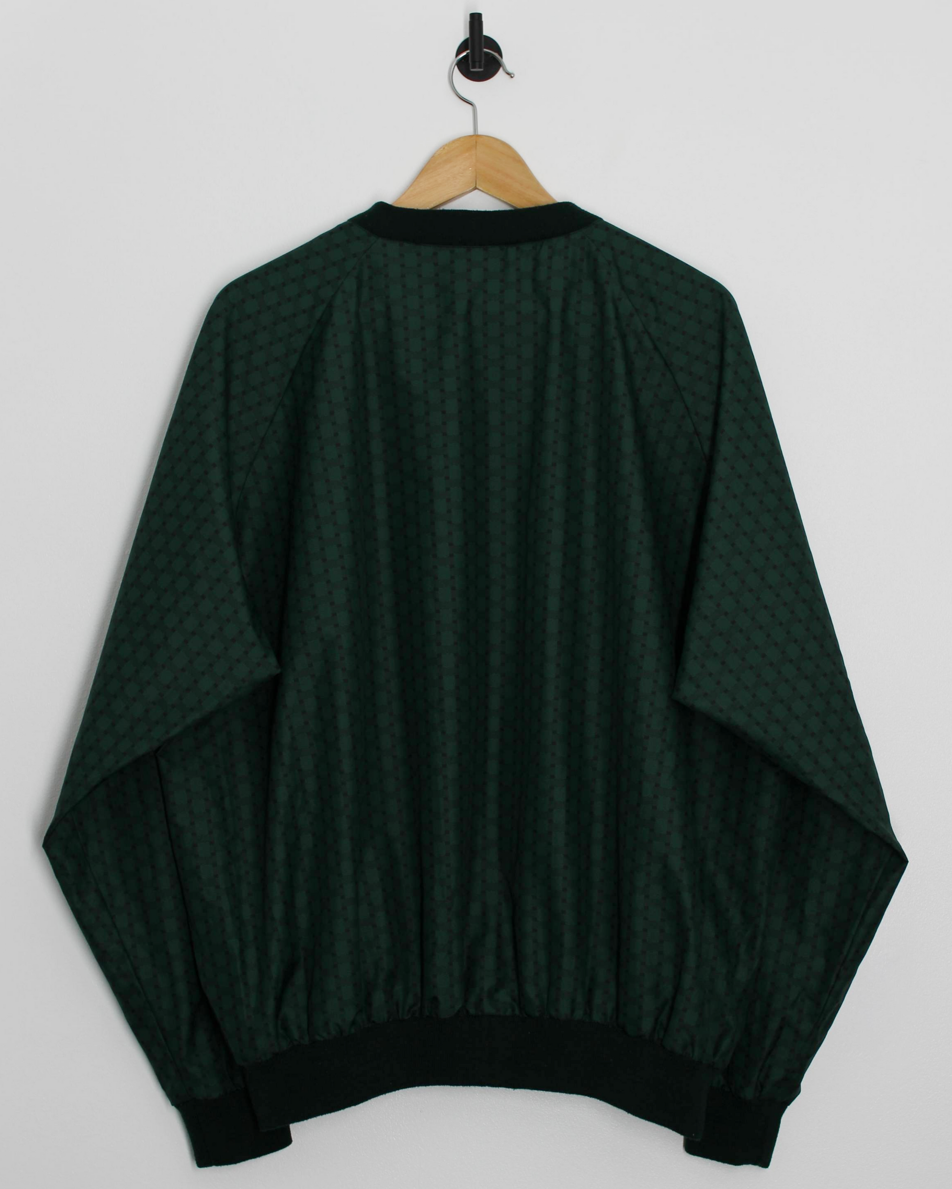 Early 2000s Sunderland of Scotland Harbour Ridge windbreaker in a size L, cut roomy with raglan sleeves and a full drape through the body. Deep green micro-check shell in lightweight polyester microfiber, finished with ribbed V-neck, cuffs, and hem. Embroidered Harbour Ridge chest hit and Sunderland crest at the sleeve, designed in Scotland with classic clubhouse proportions.