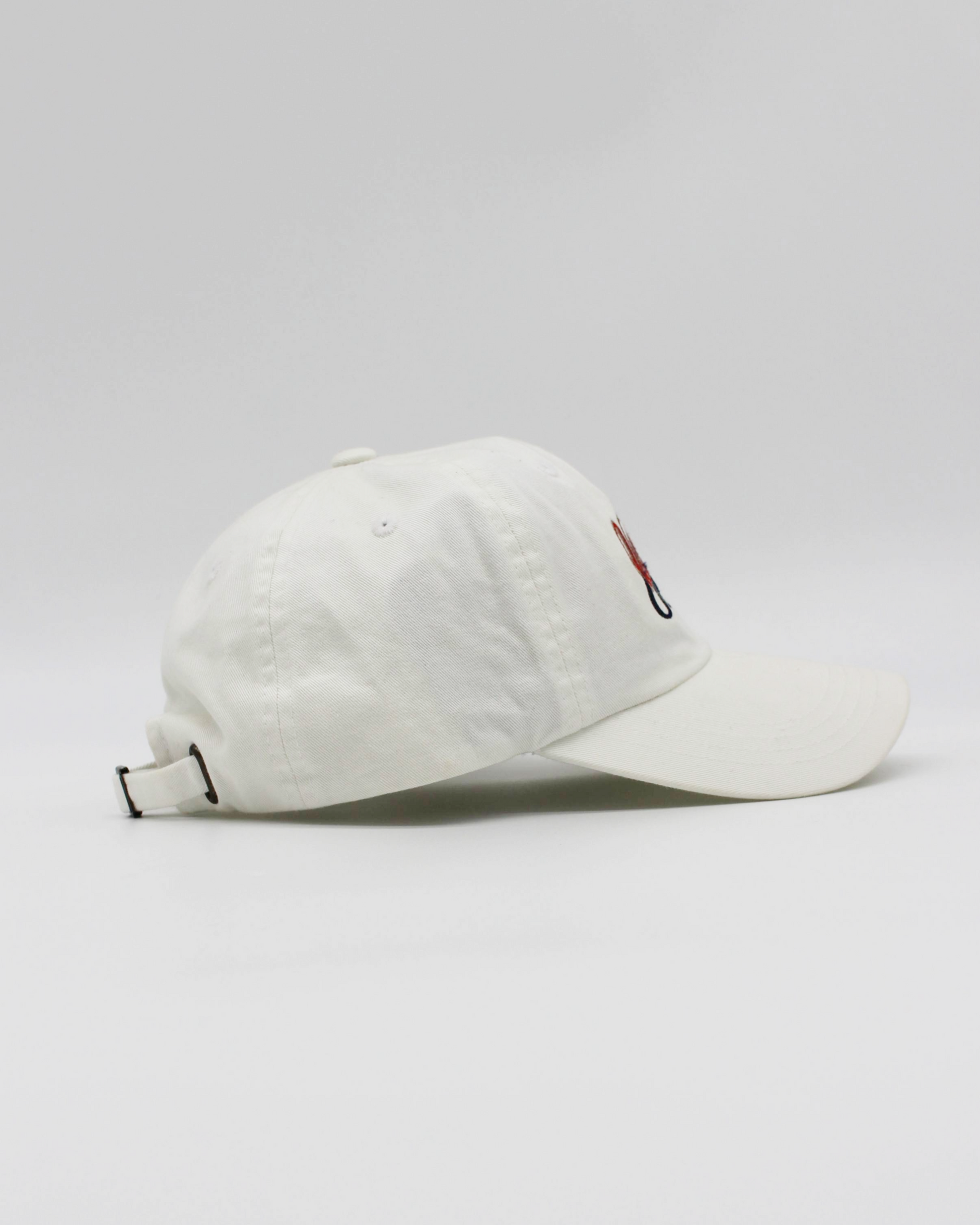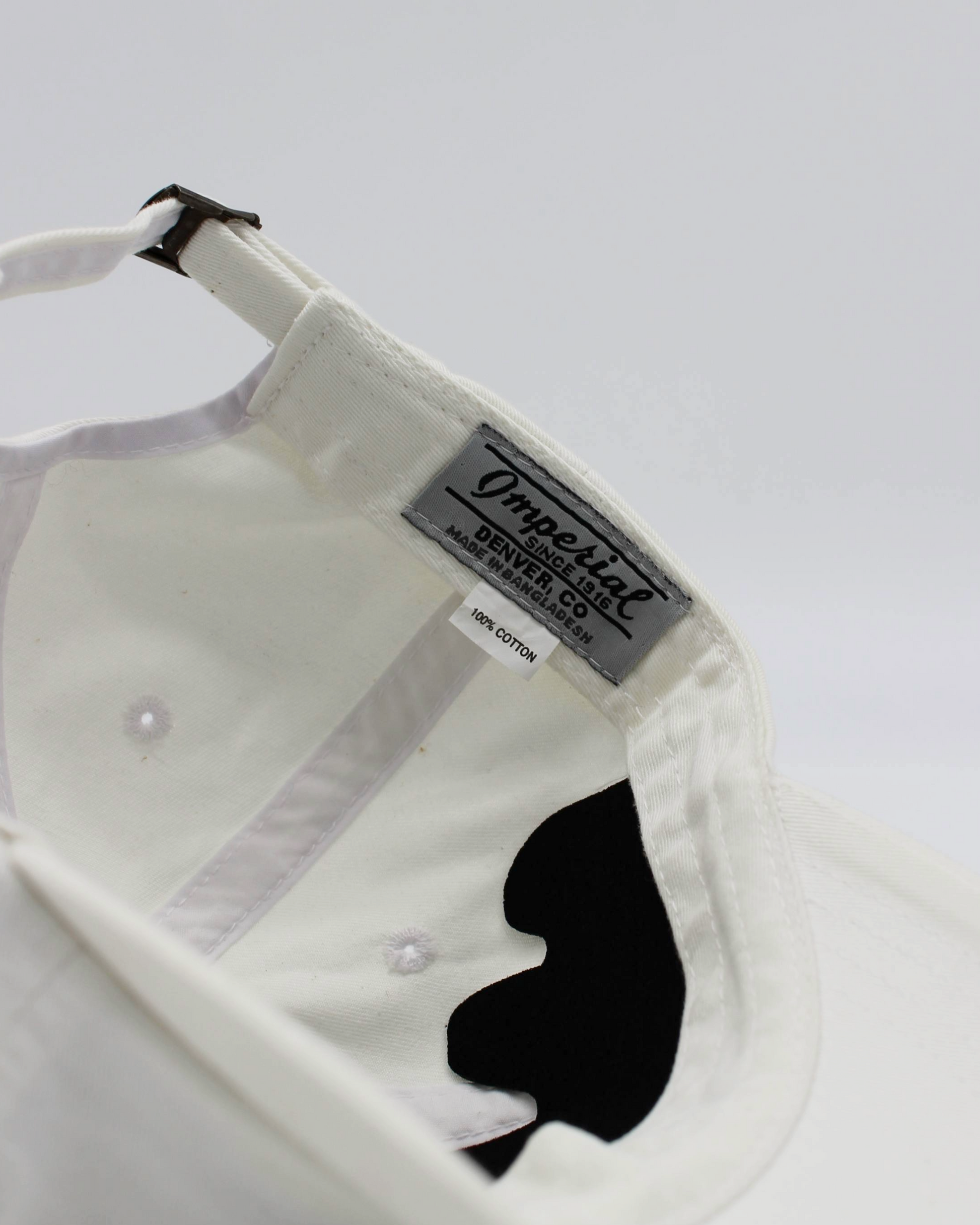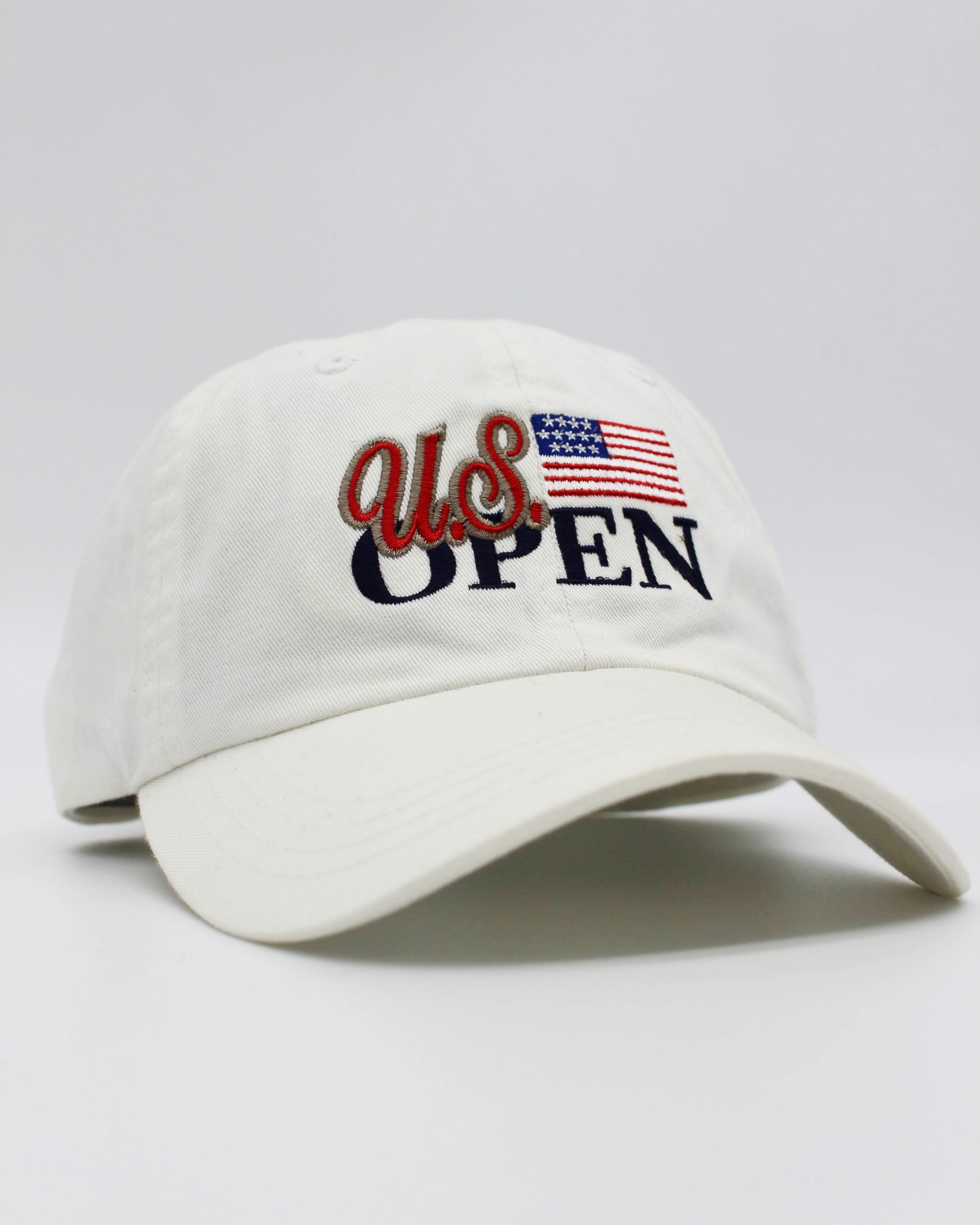 White cotton twill cap with classic six-panel construction and a gently curved brim. Features bold embroidered “U.S. Open” branding and flag detail on the front, with “2003 Olympia Fields” stitched on the side in navy and red. Finished with tonal eyelets and an antique brass buckle strap at the back for adjustable comfort. The structured yet soft shape gives it an easy, timeless fit that works both on and off the course.