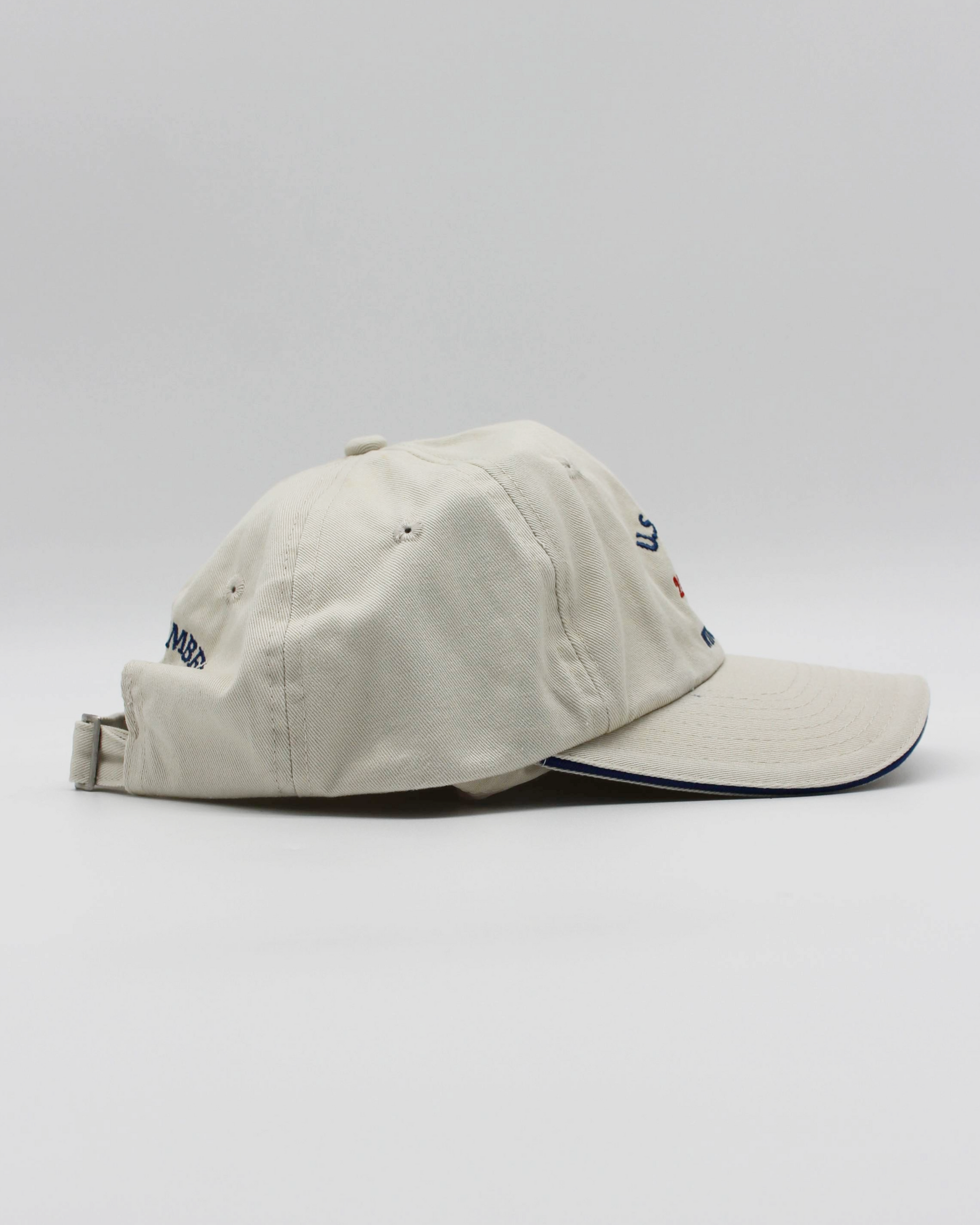 A light beige cotton cap featuring multicolour embroidery of the 2006 U.S. Open at Winged Foot logo on the front and “USGA Member” text at the back. It’s built with a relaxed six-panel profile, pre-curved brim with navy underside detailing, and an adjustable metal clasp for a secure fit. The washed cotton finish gives it a naturally broken-in texture, offering a lived-in look that wears easily on or off the course.