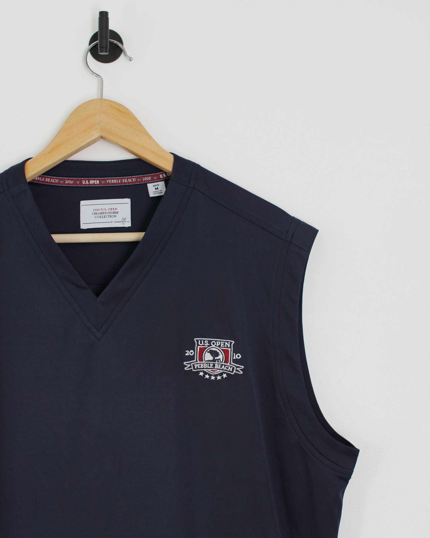 A navy performance vest from the 2010 U.S. Open at Pebble Beach, produced by Ashworth. Designed with a clean V-neck cut and lightweight polyester blend that moves easily through the swing. The front features an embroidered tournament crest in white and red, balanced by minimal detailing and a smooth finish. Its sleeveless silhouette layers naturally over polos, offering warmth without bulk - ideal for early tee times or coastal winds.