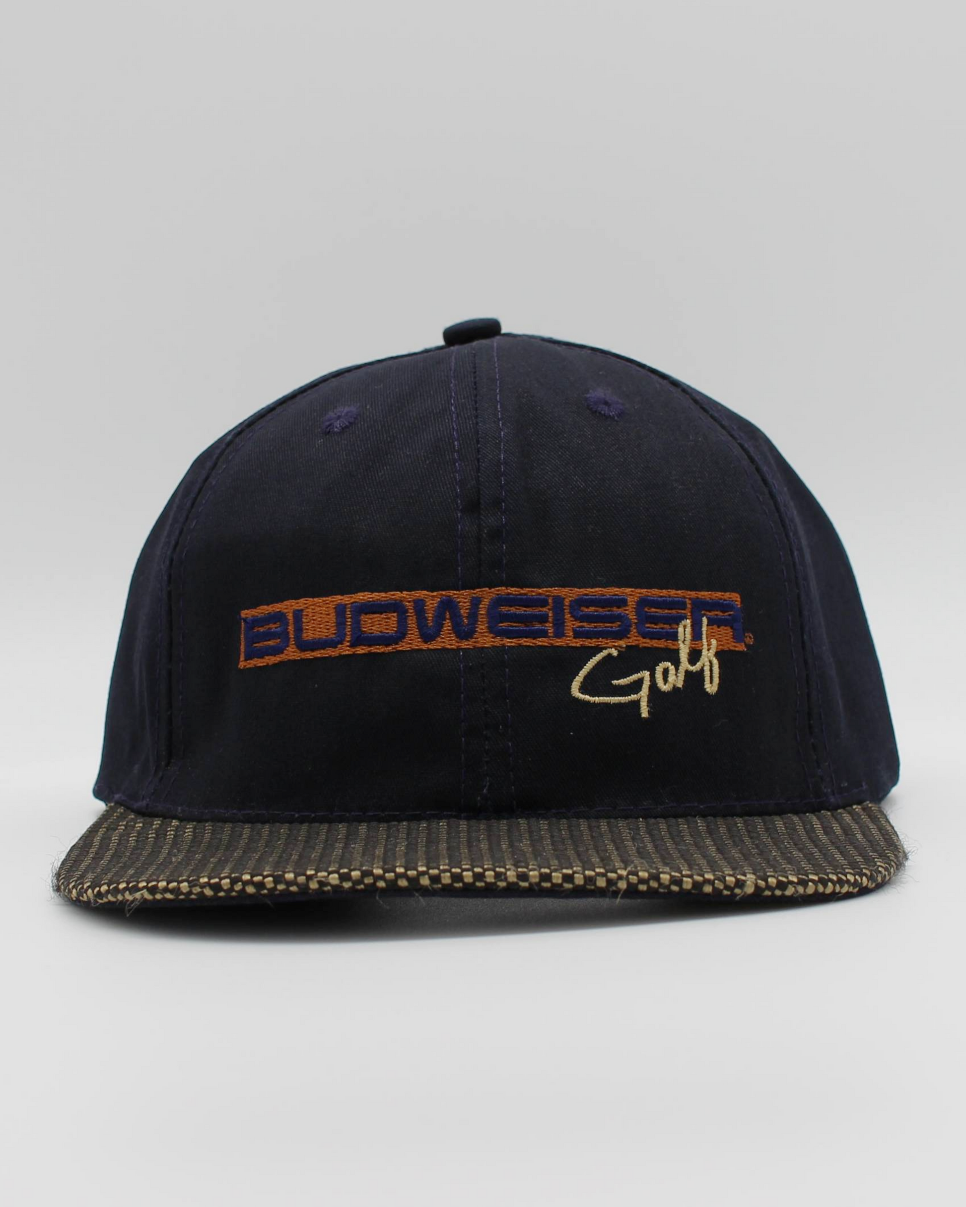 A 90s Budweiser golf cap in a deep navy cotton build with a structured crown and flat brim. Features bold embroidered Budweiser Golf branding across the front in contrast stitching, paired with a textured patterned underside on the peak. Vent eyelets add breathability, while the adjustable leather strap with metal buckle gives a secure, classic fit. Clean finish that wears well both on and off the course.