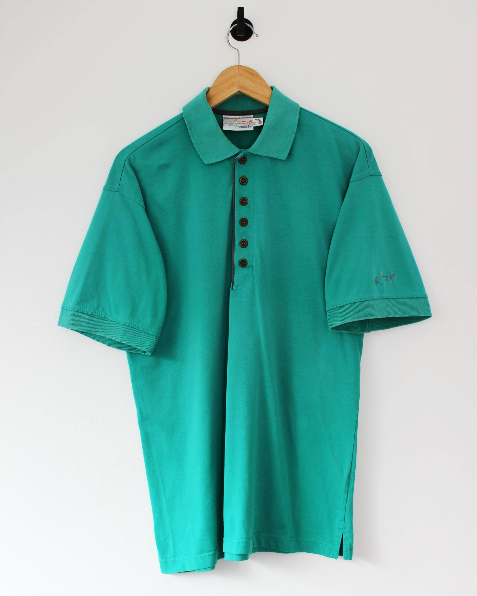 This 90s Greg Norman polo shirt is a striking piece of golf heritage, cut in a bold green tone that embodies the vibrancy of the decade. Its elongated placket with multiple buttons gives it a distinctive edge compared to standard polos, while the iconic Greg Norman shark logo is embroidered on the sleeve - an emblem of confidence and performance. The relaxed fit and soft cotton build make it equally suited for on-course wear or casual styling.