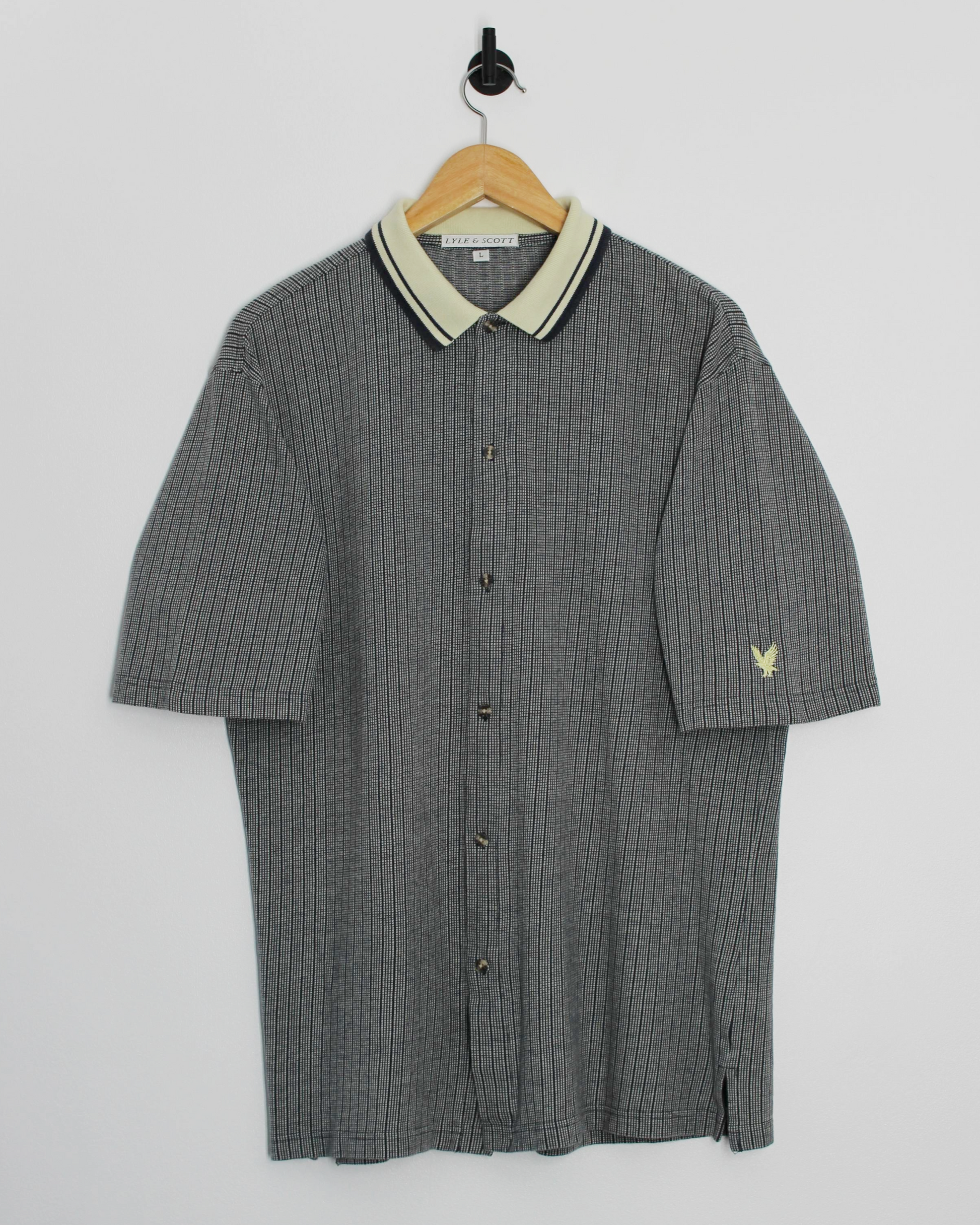 This 90s Lyle & Scott shirt comes in a charcoal micro-check pattern with a full button front and a relaxed, slightly boxy fit. The cream knit collar features twin navy stripes for a clean contrast, while the signature golden eagle on the sleeve adds a subtle hit of branding. Soft, lightweight fabric keeps it comfortable on and off the course, with short sleeves and small side vents for easy movement.