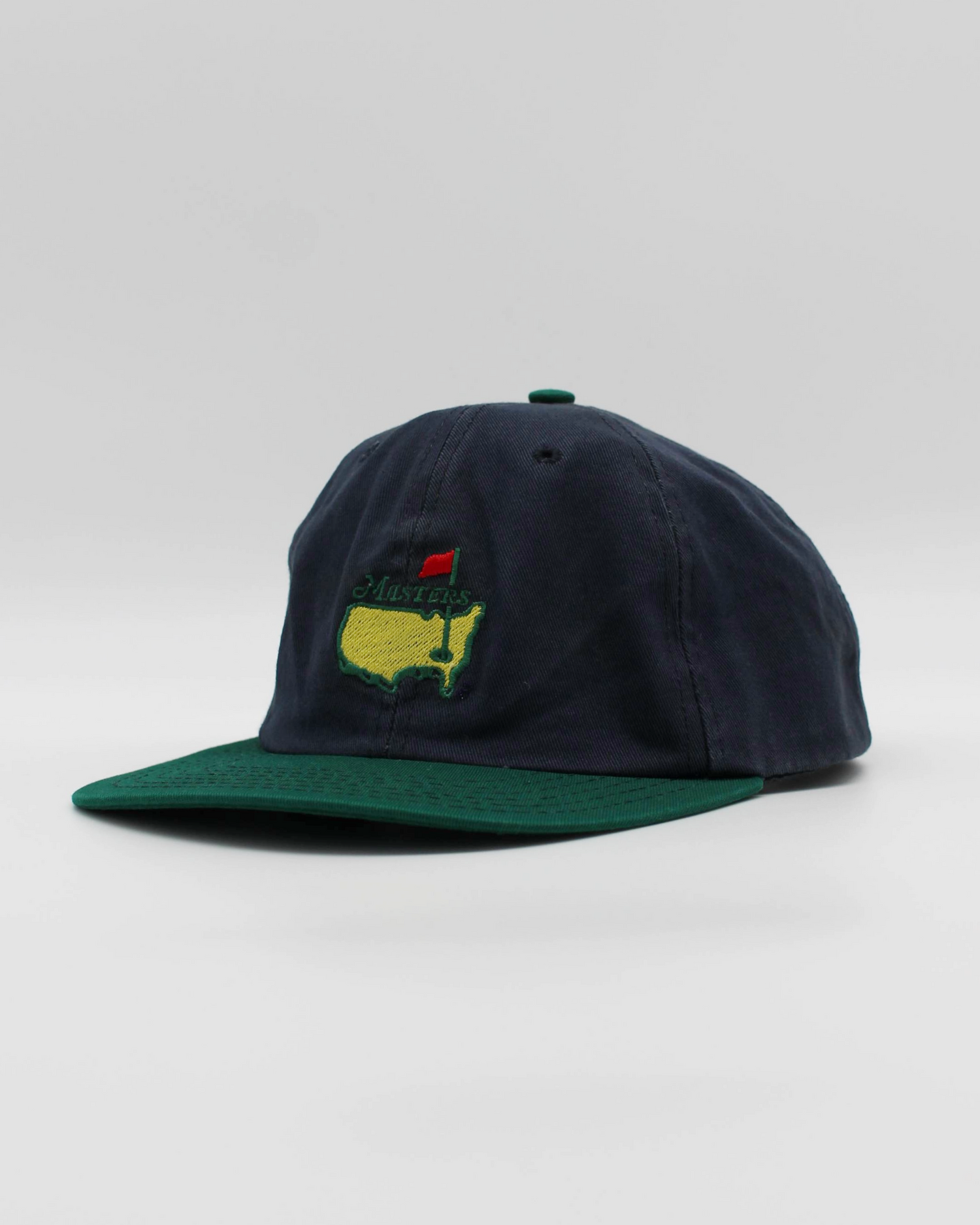 A navy and green cotton two tone cap featuring the iconic Masters tournament logo embroidered in yellow, green, and red at the front. Made by American Needle, it’s finished with a green brim, tonal eyelets, and an antique brass buckle for adjustable sizing. The six-panel structure and mid-profile crown give it a slightly retro shape, while the soft, worn texture adds to its authentic vintage feel.