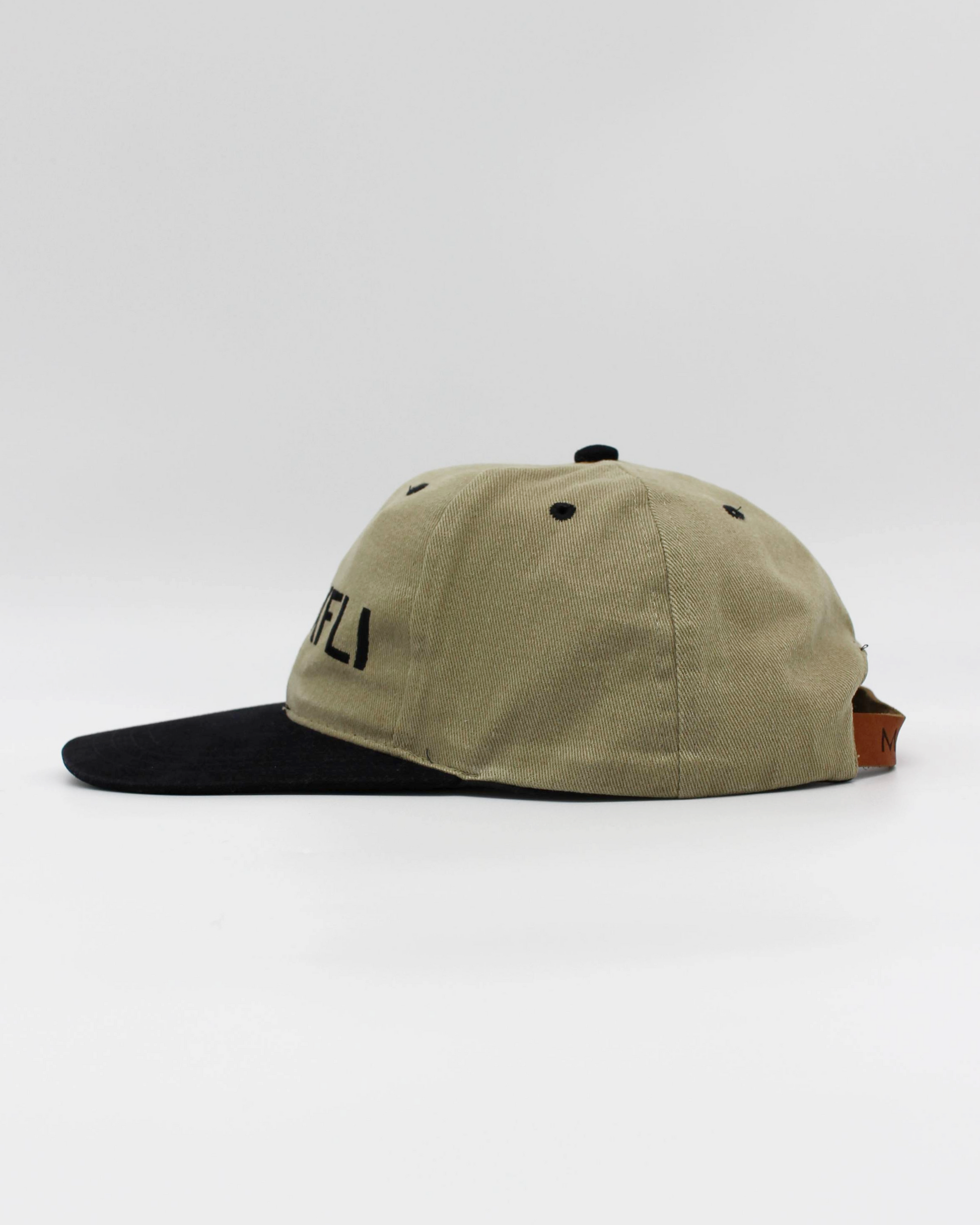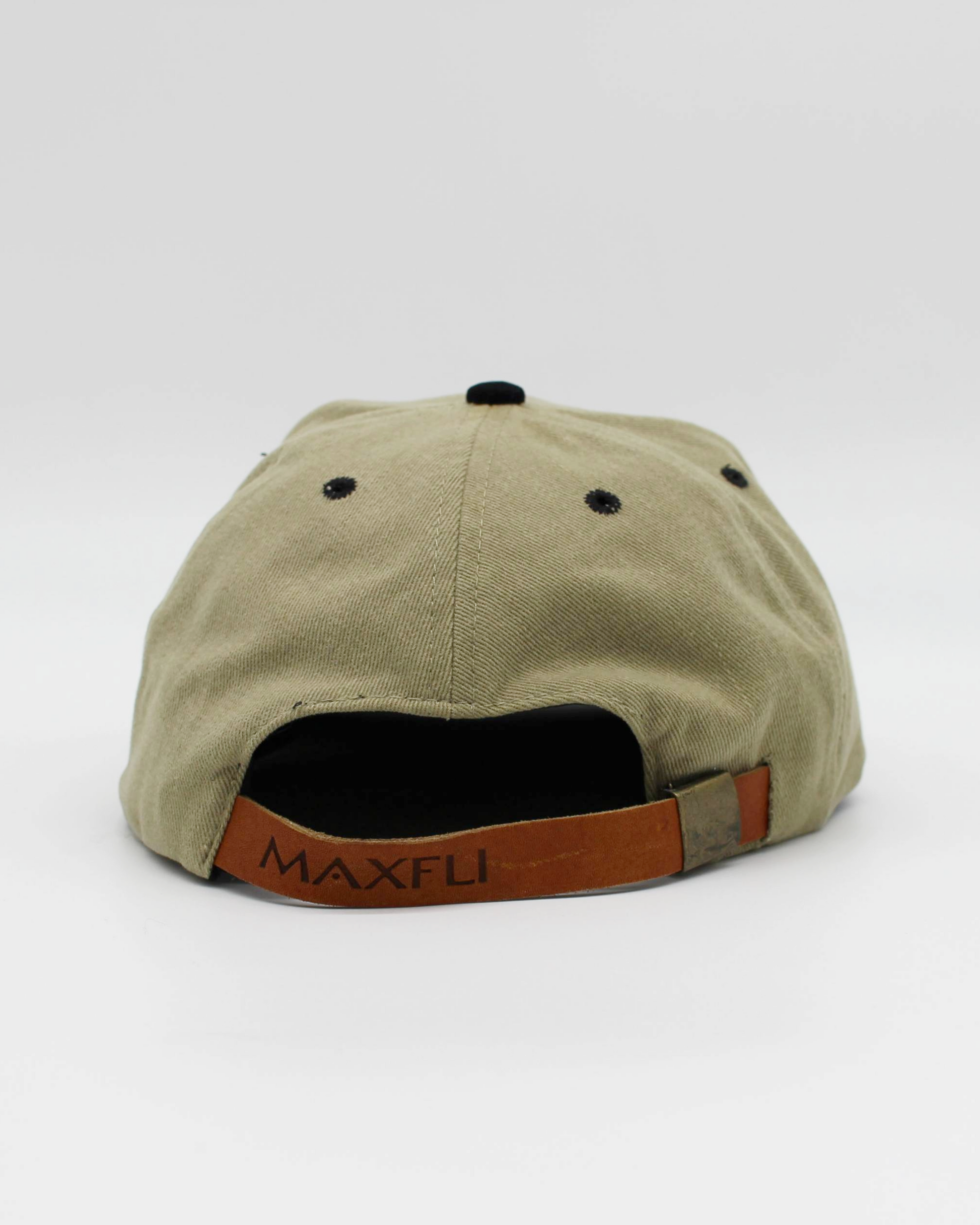 Two-tone 90s Maxfli cap in beige cotton twill with a contrast black brim and matching top button. Features bold front embroidery with the classic Maxfli logo and red dot detail. Ventilated eyelets and a structured six-panel design maintain shape, while the brown leather back strap with embossed branding adds a refined finish. Light wear and fading throughout enhance its authentic vintage character.