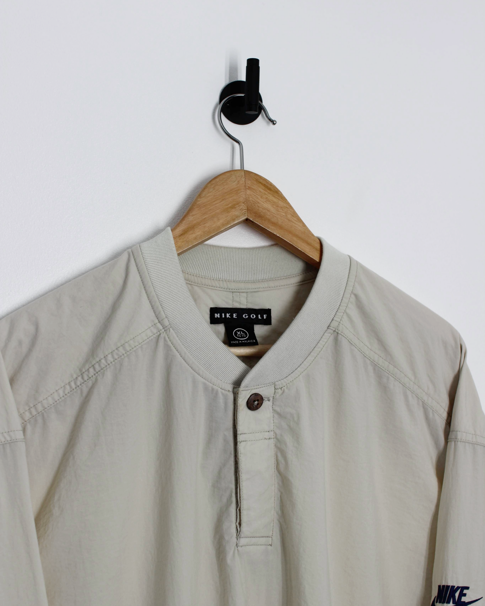 This 90s Nike cream buttoned windbreaker is a clean, understated take on classic golf outerwear. The lightweight shell has that signature 90s Nike drape - roomy, relaxed, and easy to throw on - while the ribbed collar and cuffs add just enough structure to balance the silhouette. A short button placket gives it a unique henley-style twist, setting it apart from standard pullovers of the era.