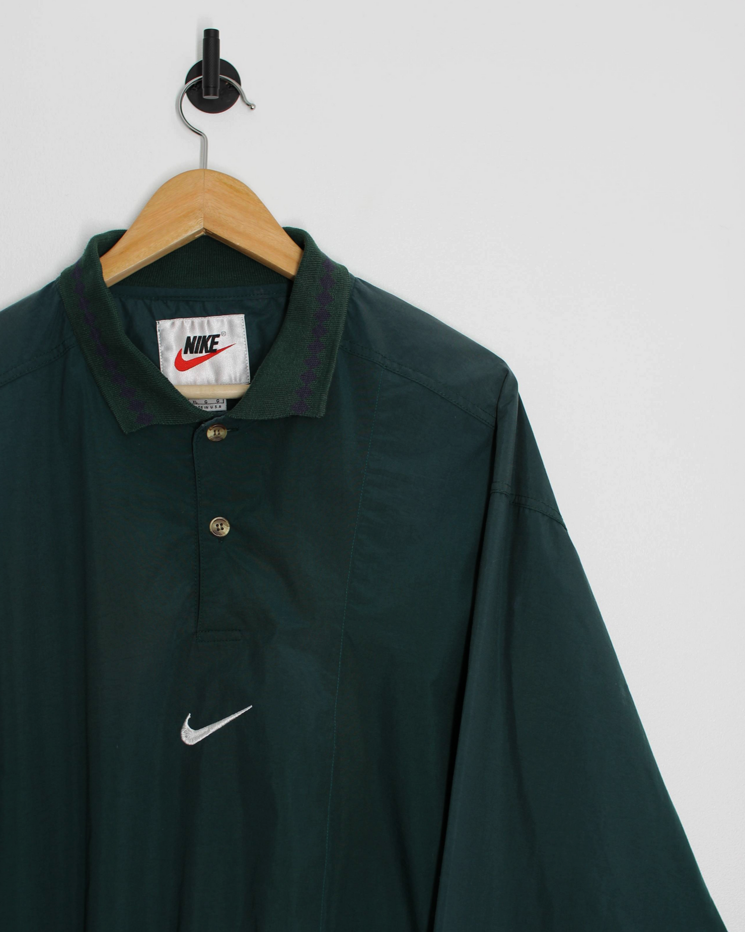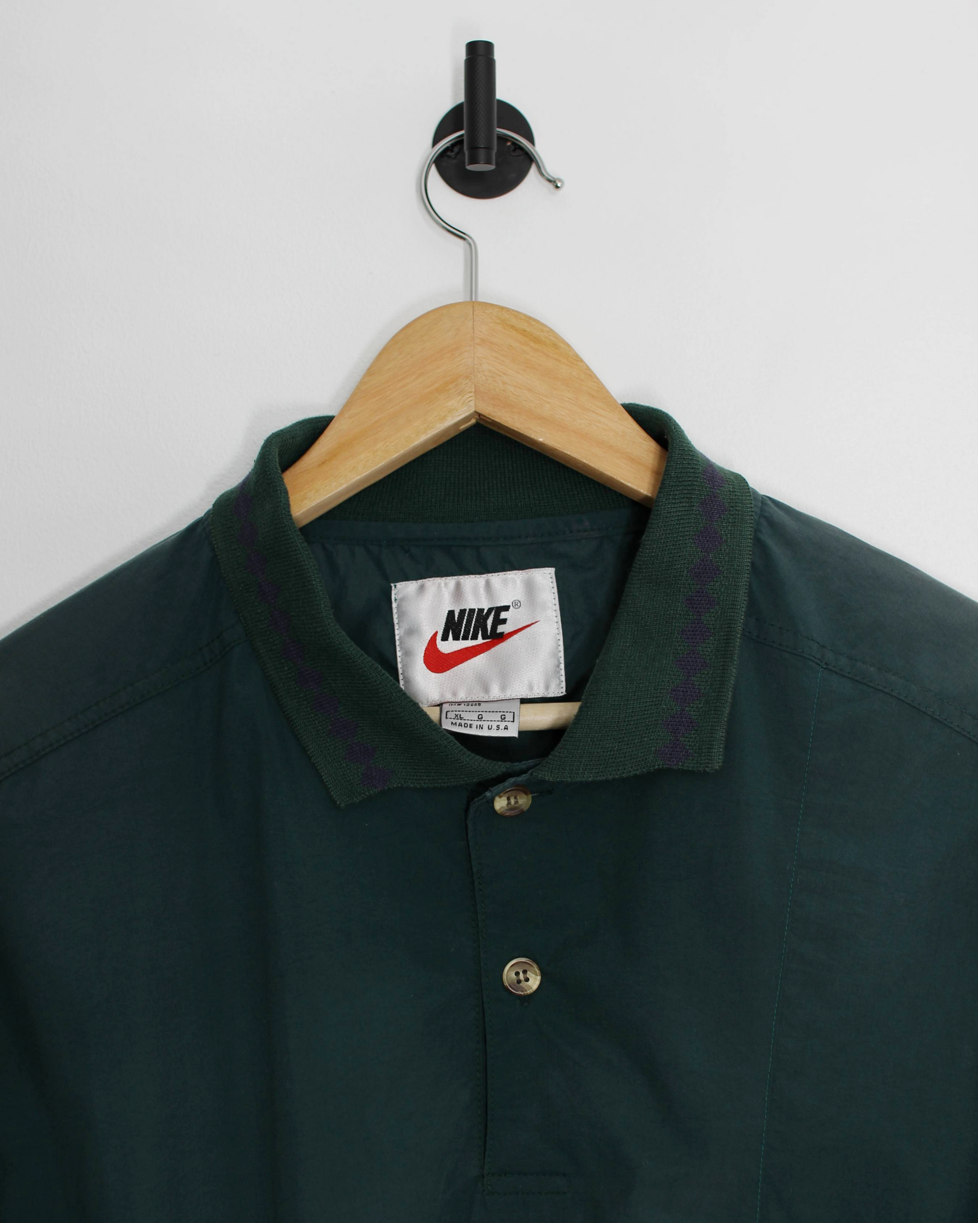 Early 90s Nike golf windbreaker in deep forest green with a soft sheen and easy, baggy cut. Made in USA, it features a ribbed knit collar with subtle purple detailing, two-button placket, and elasticated hem and cuffs for a bloused fit. White embroidered Swoosh at the chest, lightweight woven shell with a smooth hand, built to layer over a polo on cool morning rounds.