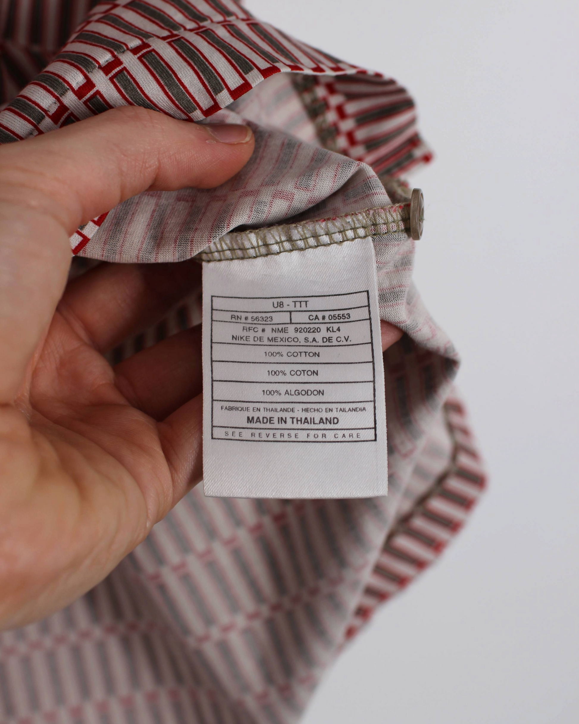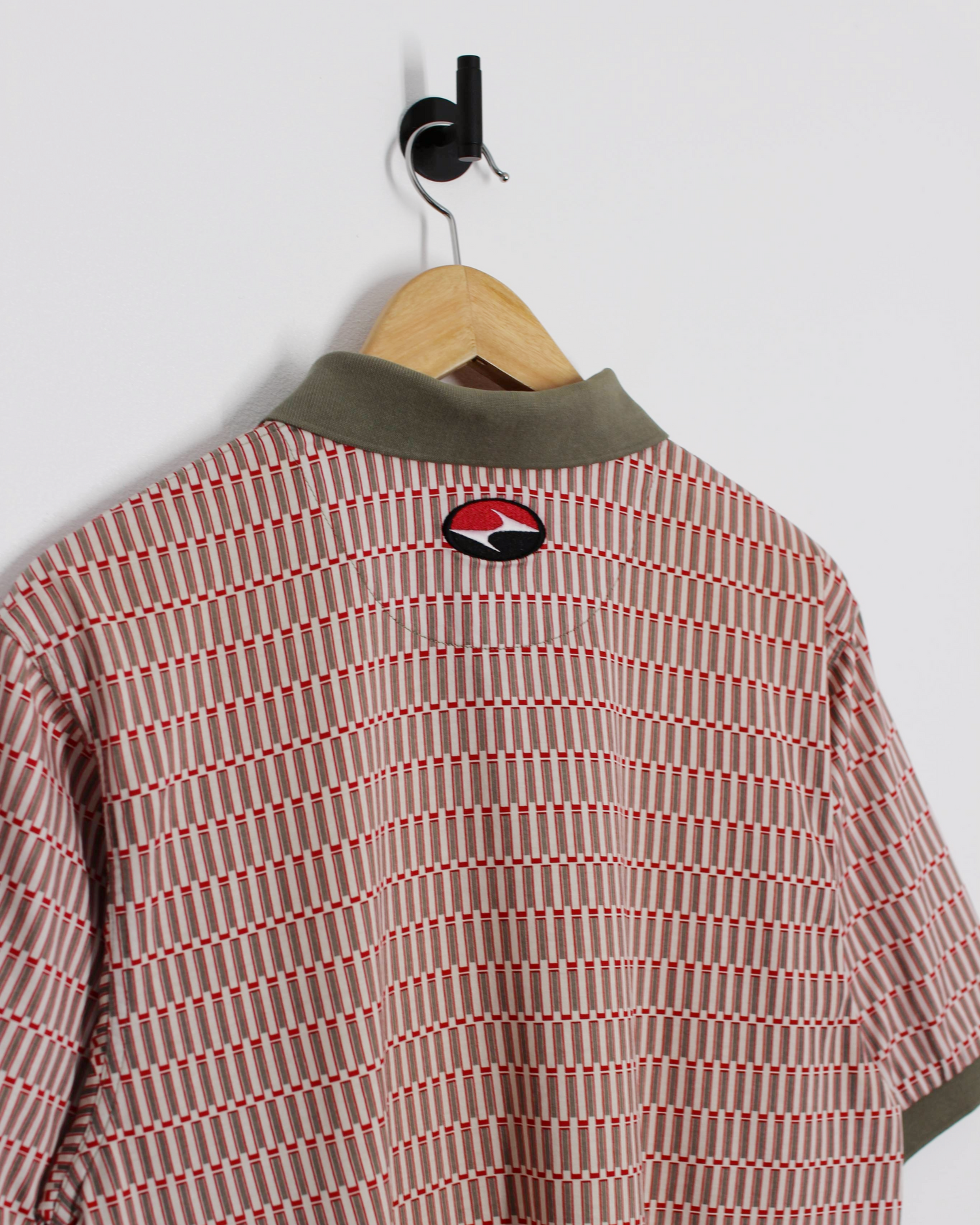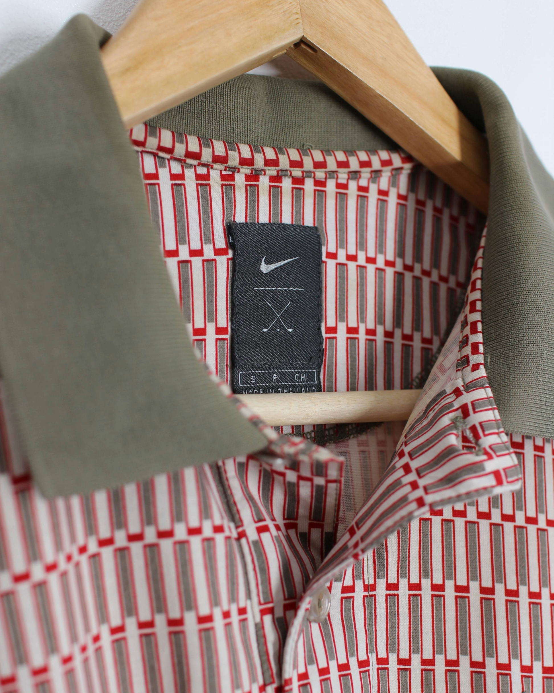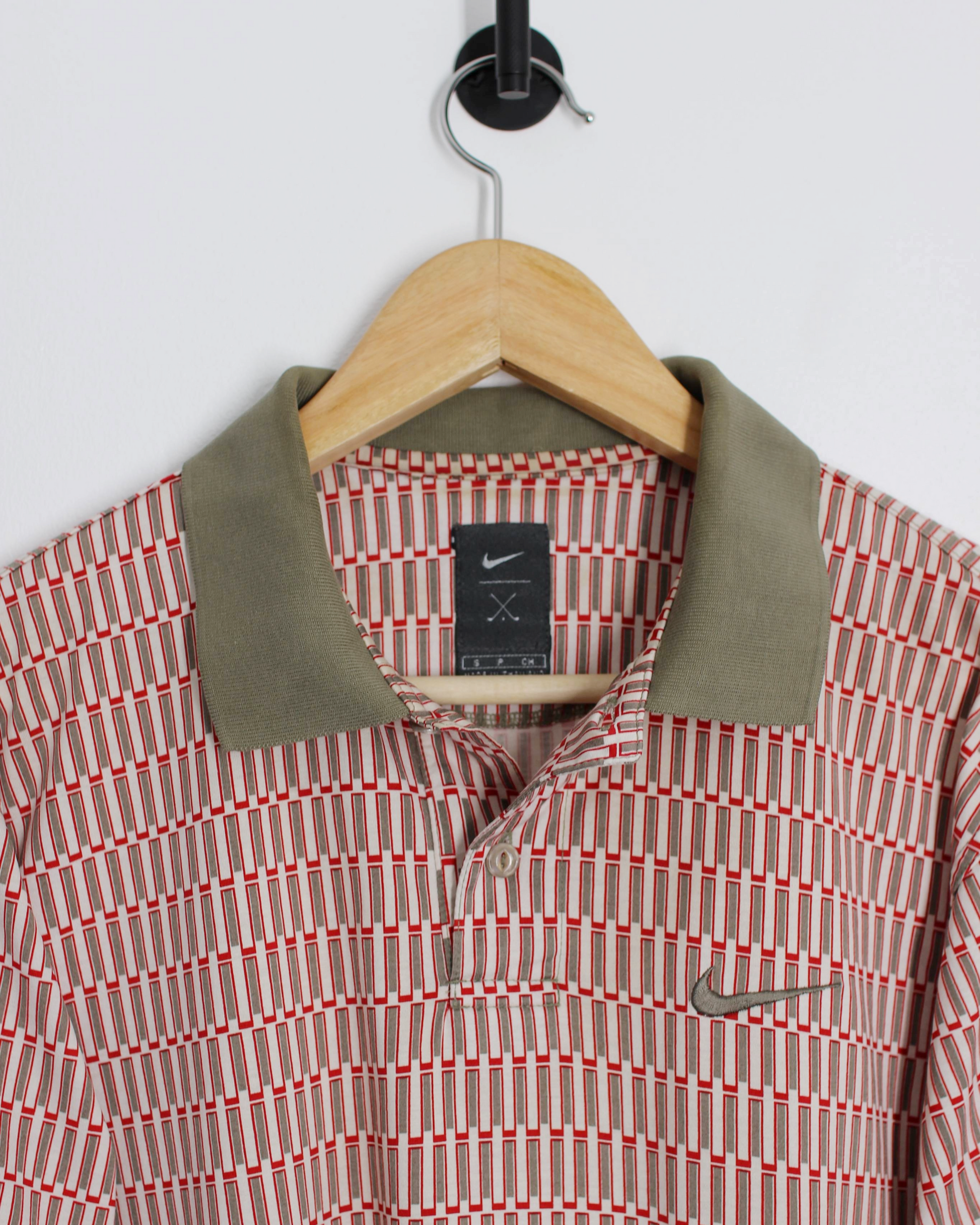A 90s Nike Golf polo designed with Tiger Woods’ era in mind, this shirt features a bold all-over red and beige geometric print with deep green contrast collar and cuffs. The front is detailed with a small embroidered Swoosh at the chest, while the back carries the yin-yang inspired Tiger Woods logo - an emblem tied to his early Nike partnership. A two-button placket and relaxed fit keep it easy to wear, while the lightweight cotton blend makes it versatile on and off the course.