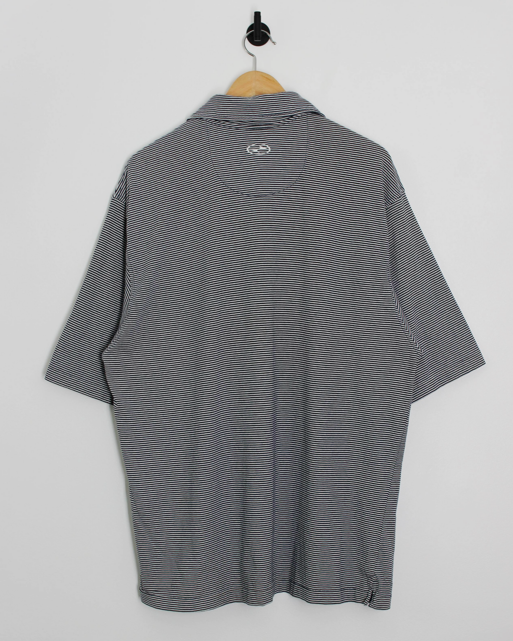 This 90s Nike Yin Yang Polo features a fine black-and-white stripe pattern with a relaxed, slightly oversized fit typical of the era. Designed with a quarter-zip neckline, embroidered Swoosh at the chest, and the Yin Yang logo at the back, it blends clean detailing with understated edge. The soft cotton blend keeps it breathable and easy to wear, while subtle side vents offer comfort and movement both on the course and off.