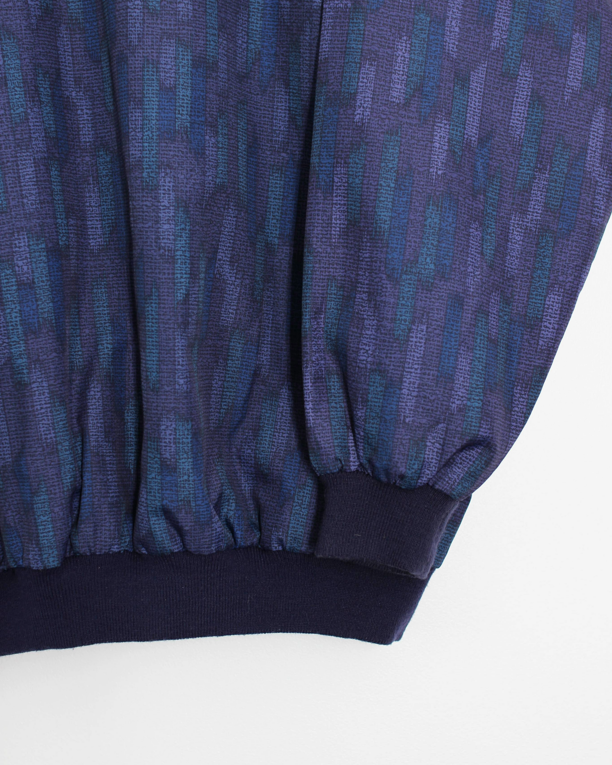 This 90s Sunderland of Scotland windbreaker comes in a deep navy and teal abstract pattern with subtle tonal texture. Designed with a relaxed, boxy fit and elasticated cuffs and hem, it delivers comfort and movement both on and off the course. The ribbed crew neckline and lightweight, water-resistant shell make it a dependable outer layer for unpredictable conditions, finished with discreet tonal branding at the back for a clean, understated look.