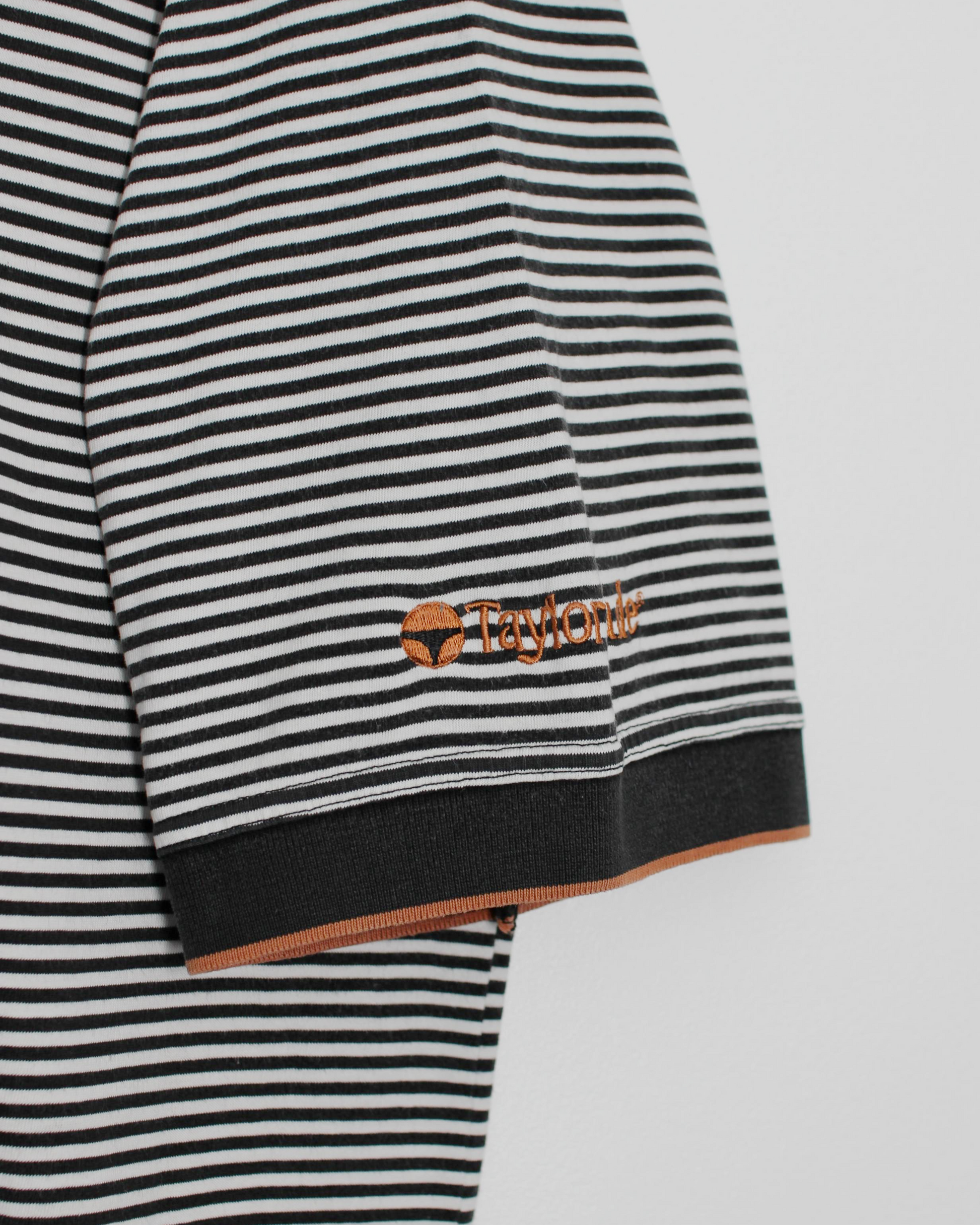 Late-90s TaylorMade polo in a tight black-and-white horizontal stripe, cut from soft cotton jersey with a dry, broken-in feel. Relaxed large fit with a longer body, split hem, and classic three-button placket. Black rib collar and cuffs with burnt orange accent tabs, plus embroidered TaylorMade branding at the sleeve. Easy, unfussy golf shirt that leans casual and wears well off course.