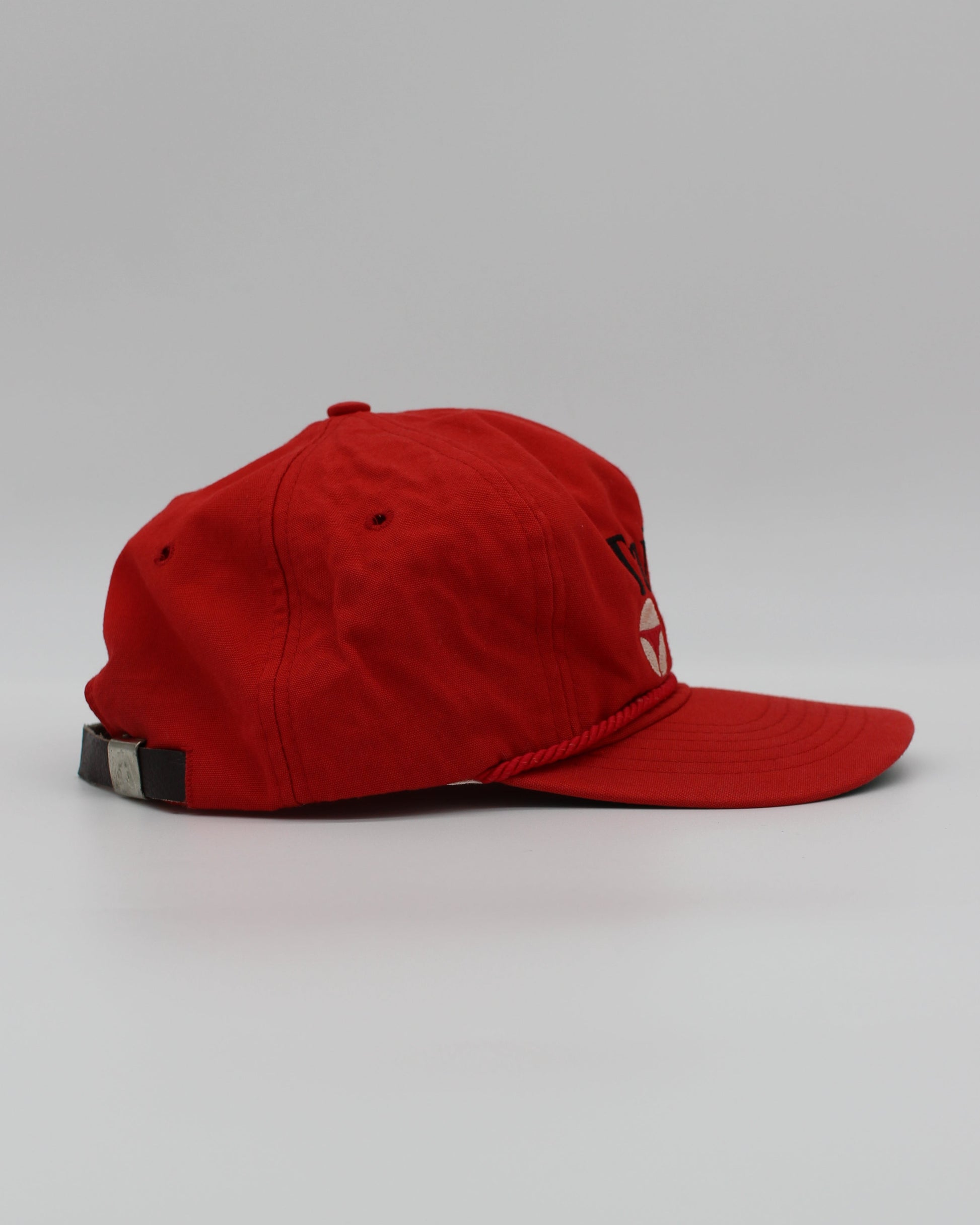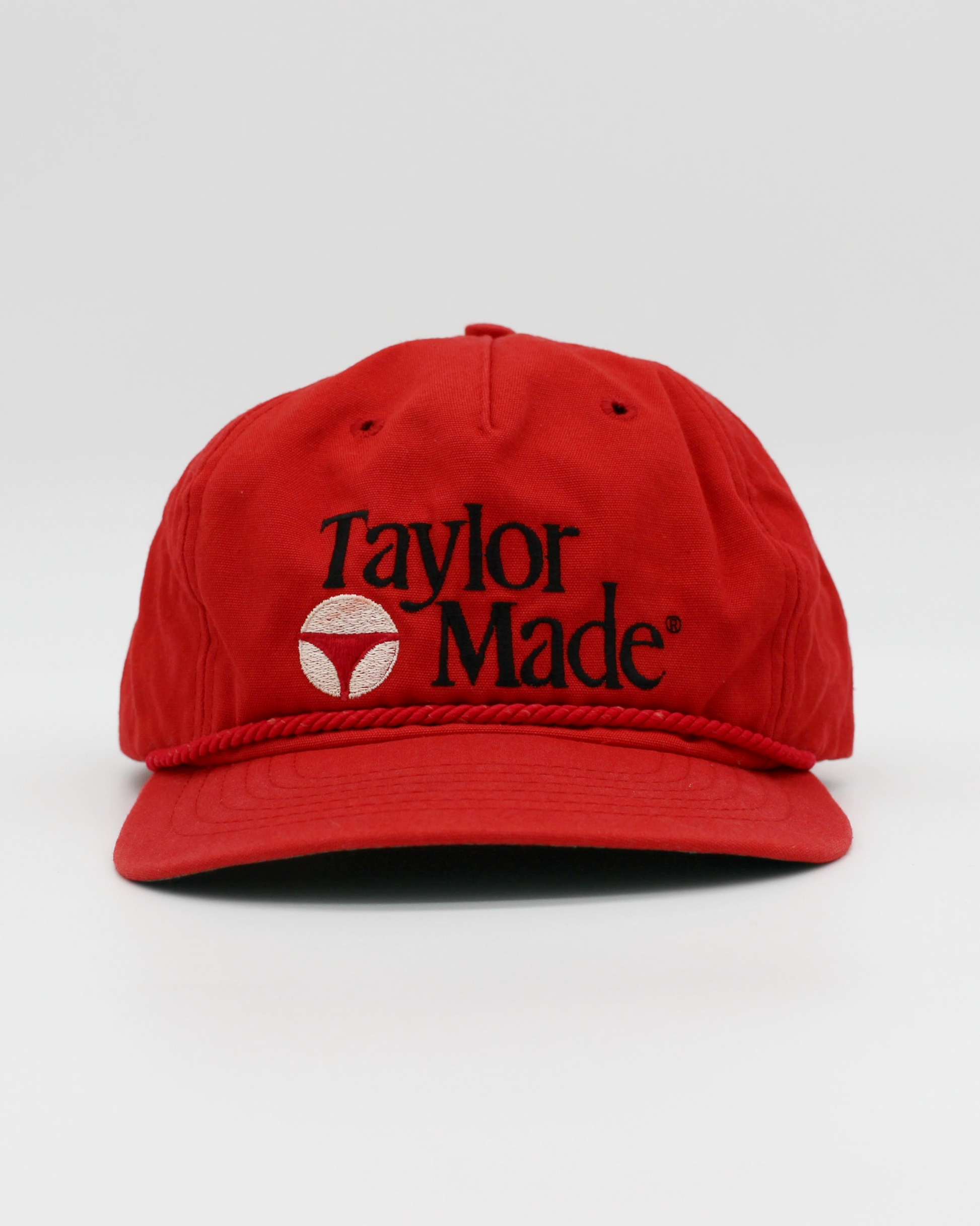 A rare 90s TaylorMade rope cap by Texace, cut in bold red with the embroidered logo and rope detail across the brim. Made from durable cotton with a structured crown, it carries the unmistakable vintage golf aesthetic that has become highly sought after among collectors. The contrasting black and white embroidery sharpens the look, while the rope trim gives it that classic 90s finish.