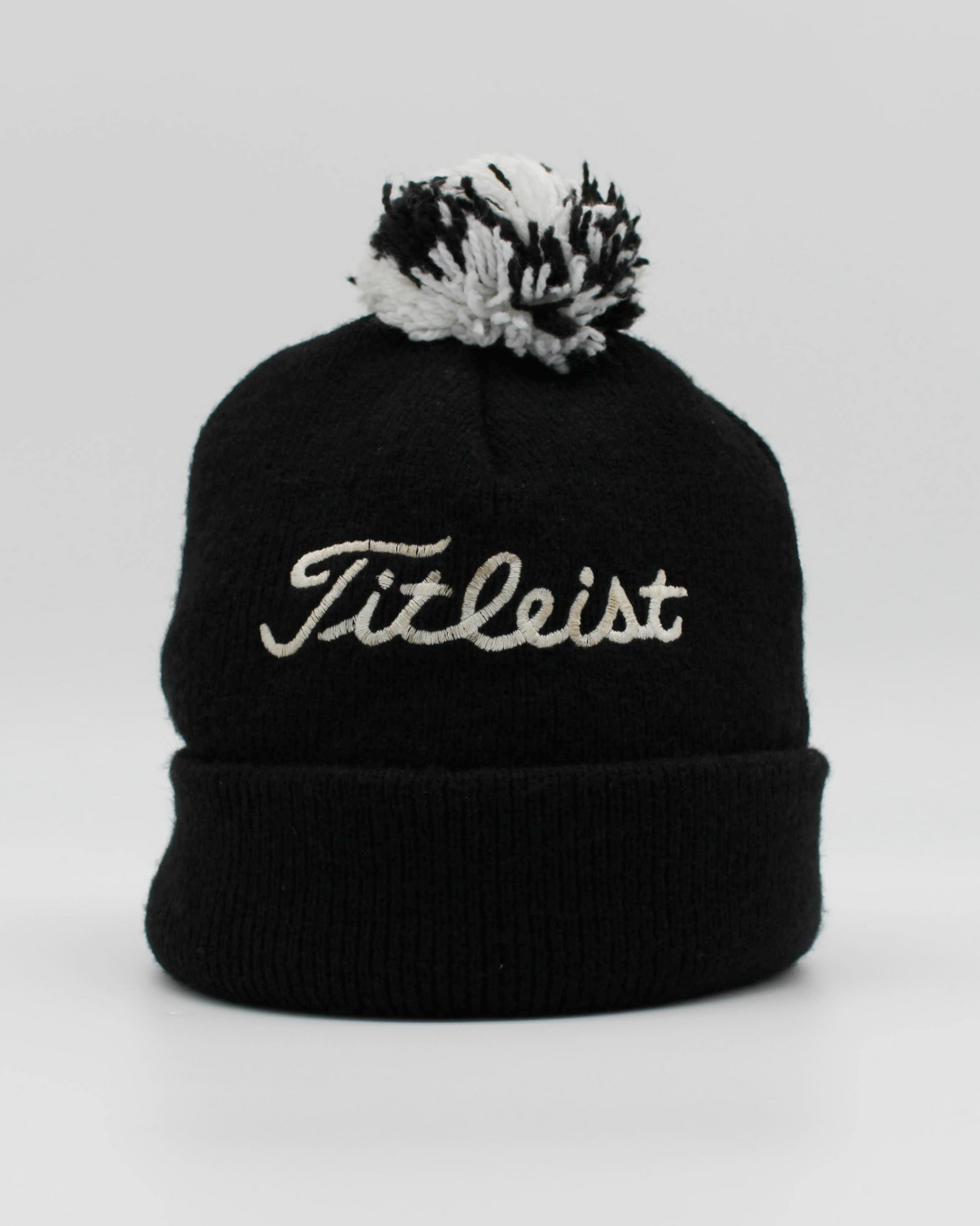 A cold-weather essential from golf’s golden era, this 90s Titleist bobble beanie brings retro tour style with understated confidence. Made from soft acrylic knit in classic black, it features white embroidered Titleist branding across the cuff and a black-and-white pom on top. The fold-over design delivers a secure, comfortable fit with a medium-weight feel ideal for cooler rounds or off-course wear.