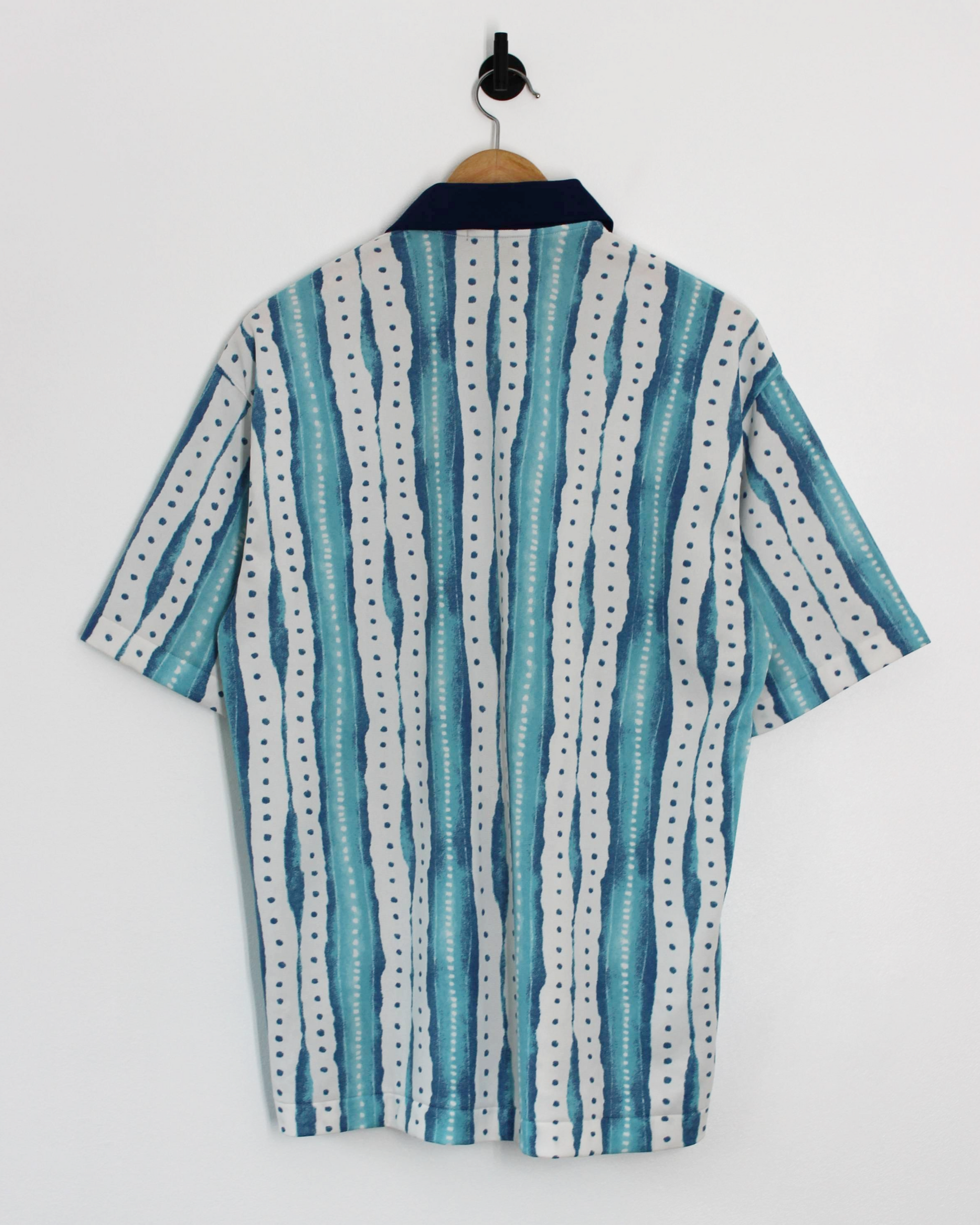 This 90s Titleist polo features an abstract blue and white stripe print with soft watercolor-style detailing and dotted accents throughout. A navy contrast collar and embroidered chest pocket logo add a clean finish to its expressive pattern. Cut from lightweight polyester with a relaxed drape, it’s breathable, easy to care for, and built for comfort both on and off the course. Classic three-button placket and straight hem complete the look.