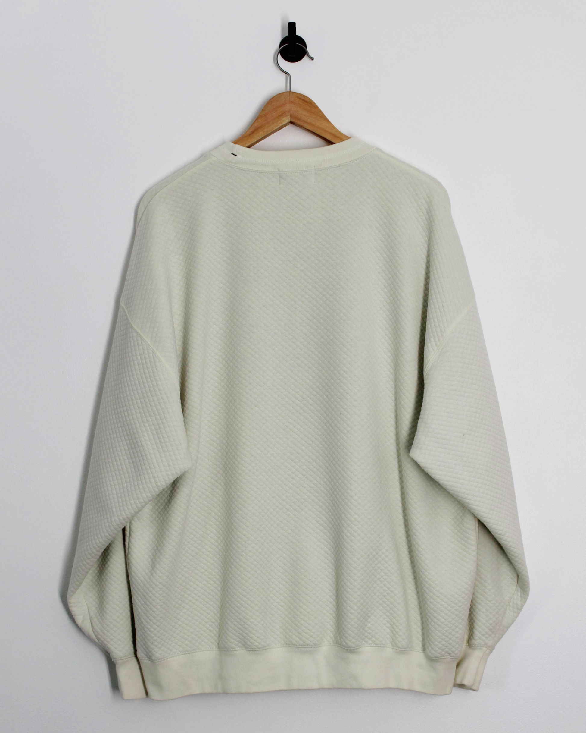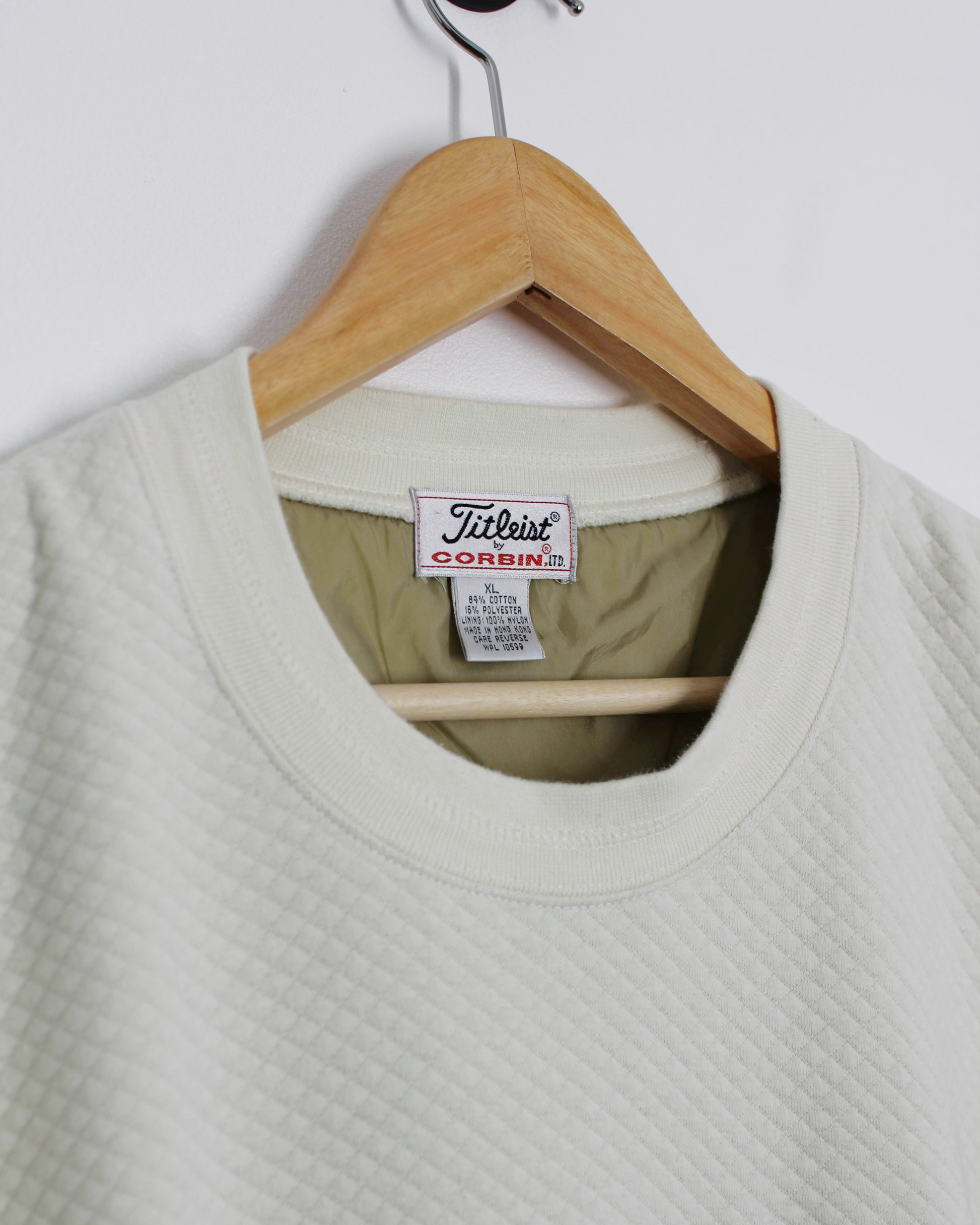 Off-white Titleist “World of Golf” crewneck featuring a textured waffle knit body and relaxed, dropped-shoulder fit. The front showcases an embroidered graphic of Mickey Mouse mid-swing surrounded by international flags, finished with a subtle Titleist label at the collar. Ribbed cuffs and hem give it a classic silhouette, while the quilted fabric adds light structure and warmth for cool mornings on or off the course.