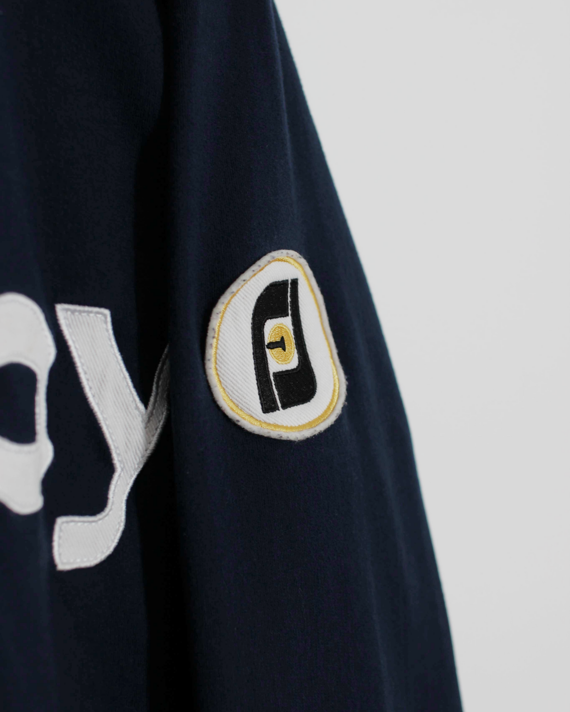 This FootJoy Heritage Collection full-zip sweatshirt comes in a deep navy tone with bold white detailing across the chest and trim. The oversized “FootJoy” appliqué logo brings a vintage collegiate feel, paired with a striped rib-knit collar, cuffs, and hem for a clean, athletic finish. Made from midweight cotton blend fleece, it offers a structured yet relaxed fit with smooth zip closure and a tonal embroidered sleeve patch for added texture and authenticity.