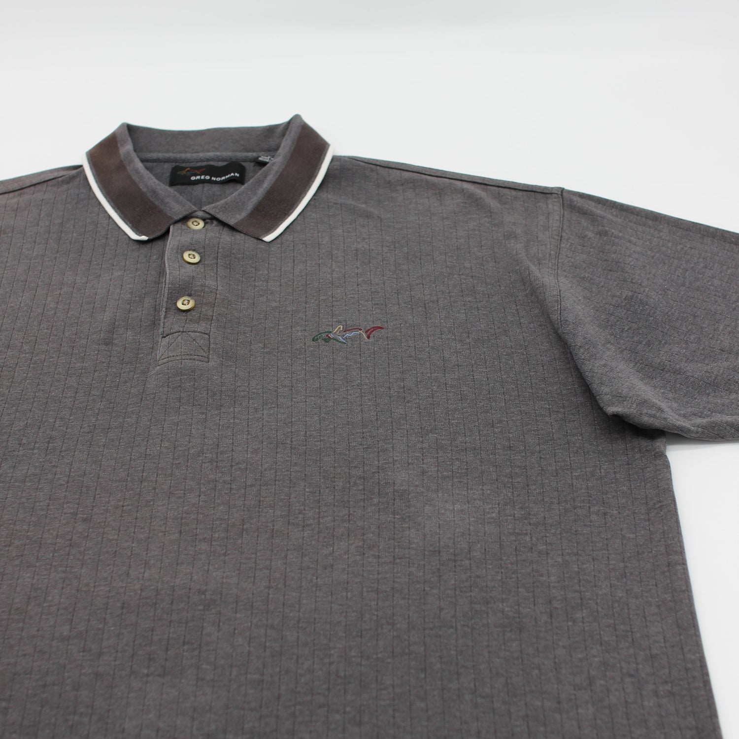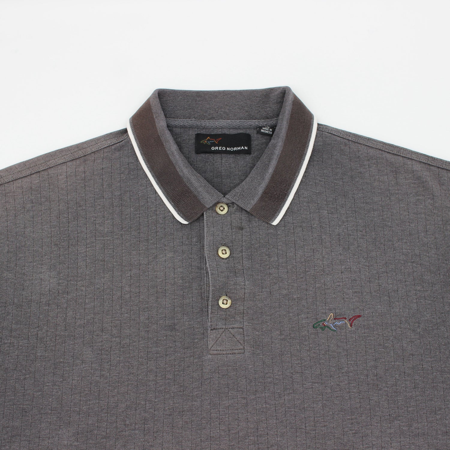 This Greg Norman Grey Polo-Shirt is a classic piece from the 1990s, made from soft grey cotton and designed with spaced vertical lines woven throughout the body to add texture and subtle visual depth. The multicoloured Greg Norman shark logo is embroidered on the chest, instantly recognisable as a symbol of the brand’s bold identity. The sleeves are finished with ribbed cotton hems, while the collar features a thick dark grey stripe with a thinner white line on the edge, giving structure and contrast. At the back neck, two small triangle motifs are stitched side by side - a lesser-seen detail from vintage Greg Norman designs. This polo is in good condition, with some overall wear evident, consistent with its age.