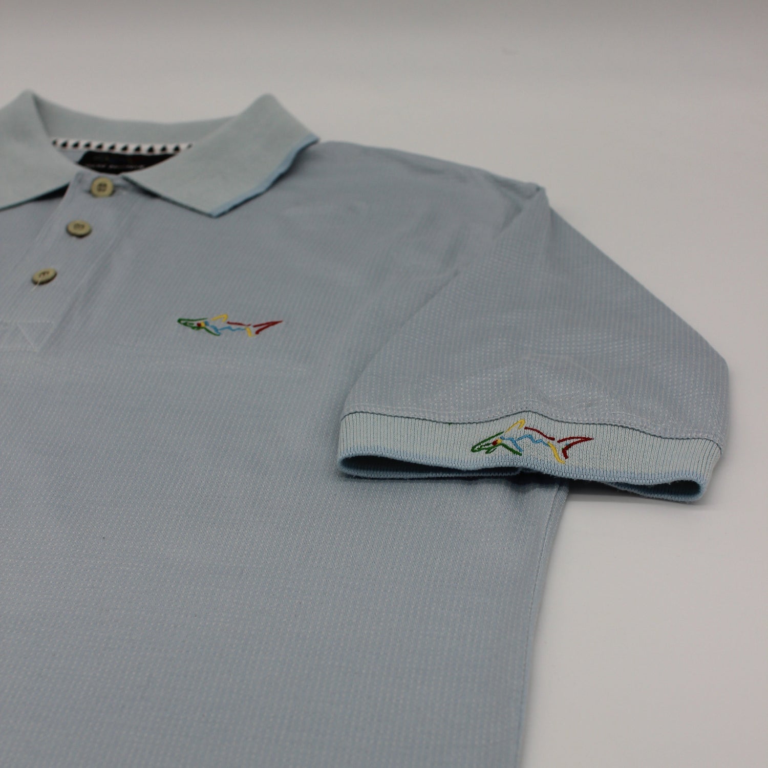 An early 2000s Greg Norman polo in a soft light grey tone, accented by the brand’s iconic multicolour shark embroidery on the chest and sleeve. Cleanly cut with a structured collar and three-button placket, it carries a subtle texture in the fabric that elevates it beyond a basic. The understated palette allows the shark emblem to stand out, offering a quiet nod to one of golf’s most recognisable figures.