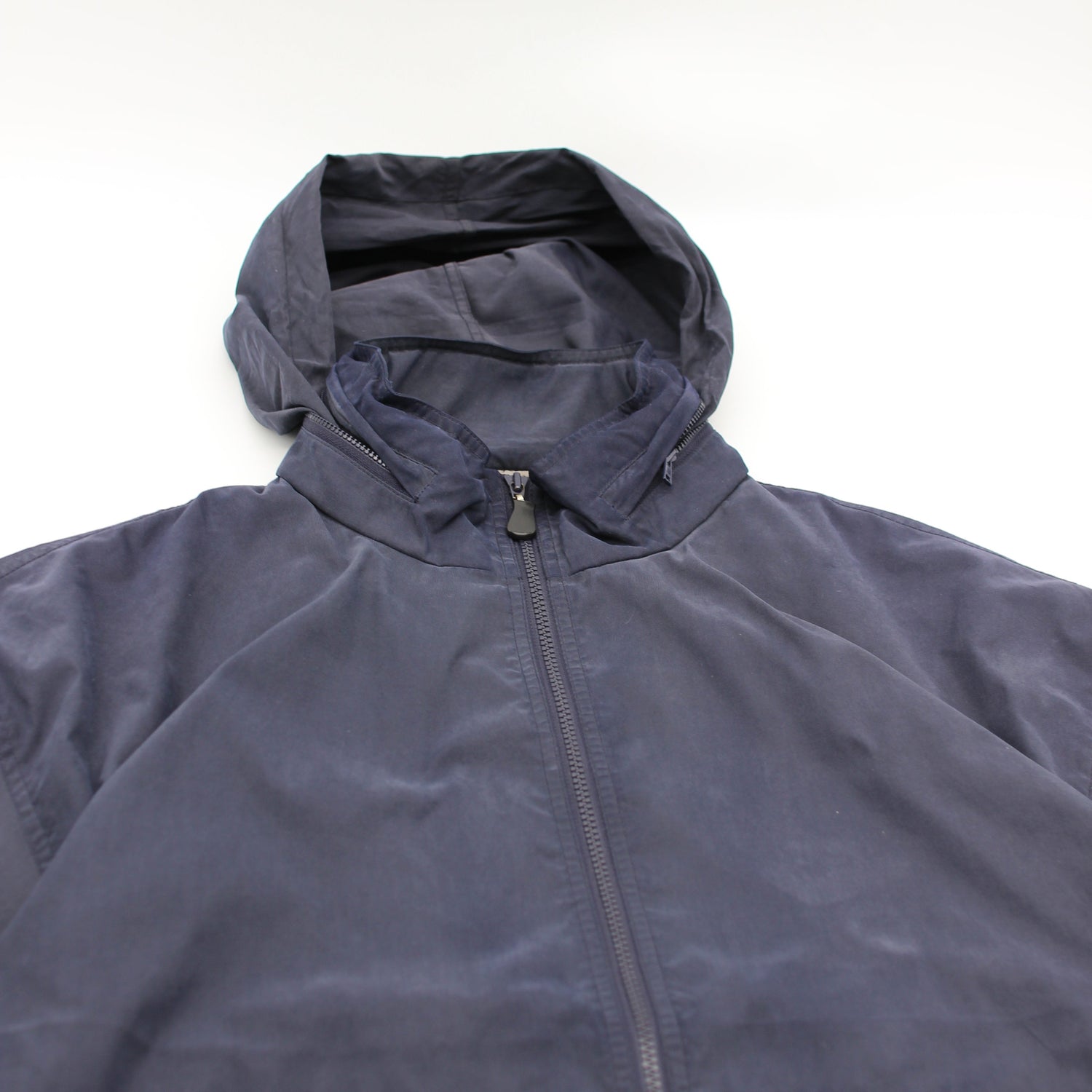 This Greg Norman Navy Full Zip Jacket is a classic Harrington-style outerwear piece from the 1990s, made from a durable blend of 85% polyester and 15% nylon. Fully navy throughout, it features a concealed zip-away hood stored neatly within the collar, adding functionality without interrupting the clean silhouette. A small multicoloured shark logo is embroidered on the upper back, keeping the branding subtle and refined. Lightweight yet protective, the jacket offers a timeless fit ideal for transitional weather.