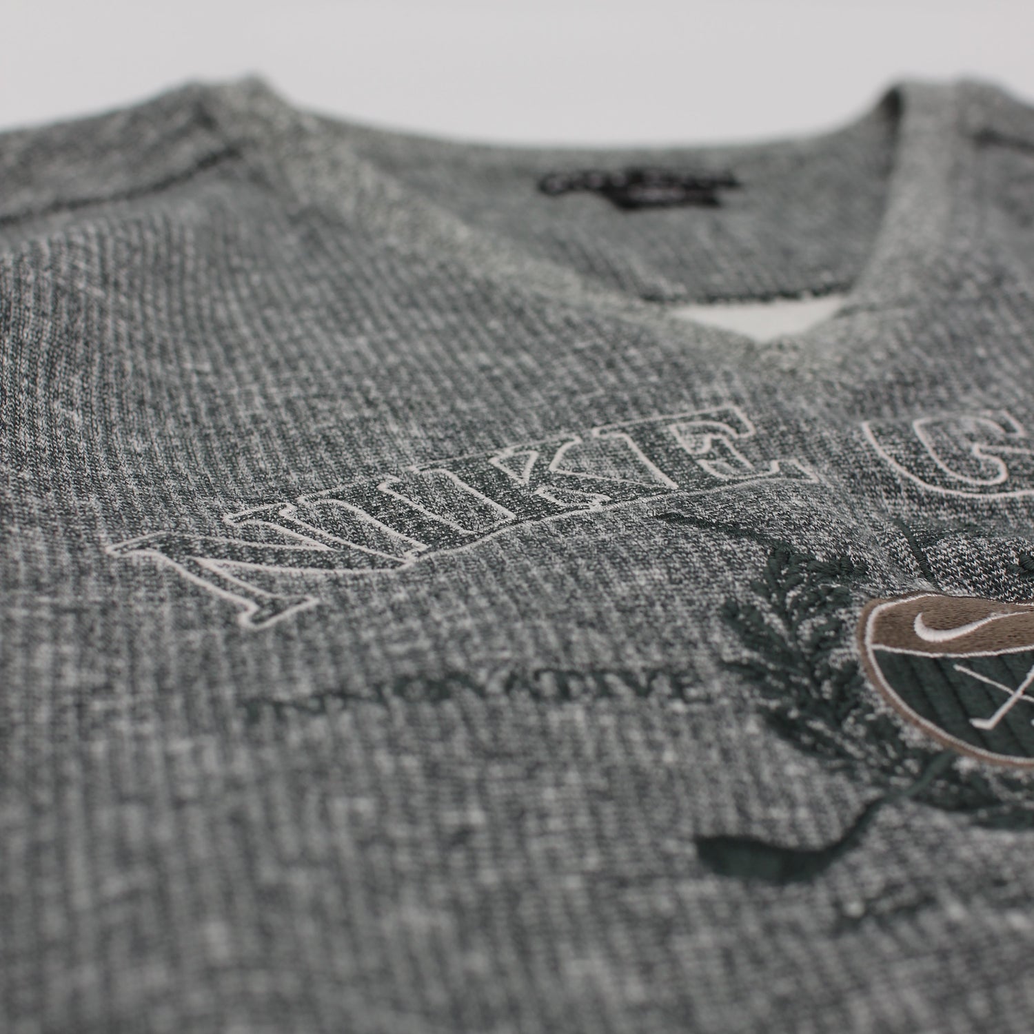 Crafted in a soft heathered grey knit, this Nike Golf jumper captures a refined balance between sporting tradition and understated elegance. The relaxed V-neckline, ribbed trims, and subtly voluminous cut create a silhouette that feels both effortless and intentional. Across the chest, an embroidered crest - complete with laurel leaves, crossed clubs, and the iconic Swoosh - introduces a quietly distinguished focal point, while the textured weave lends depth and tactile richness.