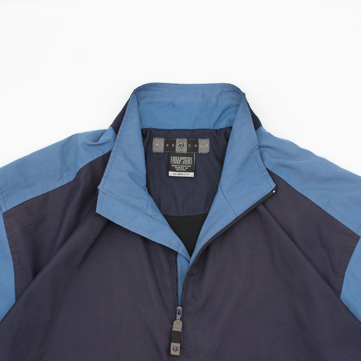 This early 2000s Nike Golf half-zip jacket features a navy body with contrasting blue sleeves. Constructed from lightweight, wind-resistant fabric with a relaxed fit for easy layering. Features a Nike Golf shield logo on the front zip, and ‘Clima-FIT’ branding across the back - Nike’s early technical fabric designed for wind and light rain protection.