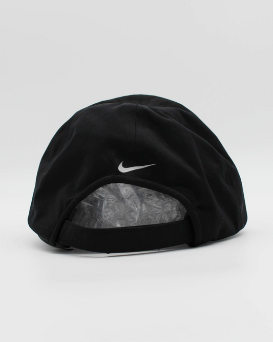A matte black performance cap built from Nike’s Storm-FIT fabric for lightweight water and wind resistance. It features a reflective silver Swoosh at the front and back, tonal stitching, and an adjustable Velcro strap for a clean, secure fit. The structured crown and slightly curved brim create a sharp, athletic shape that transitions easily between sport and street. Designed for movement, it keeps its form without feeling rigid.