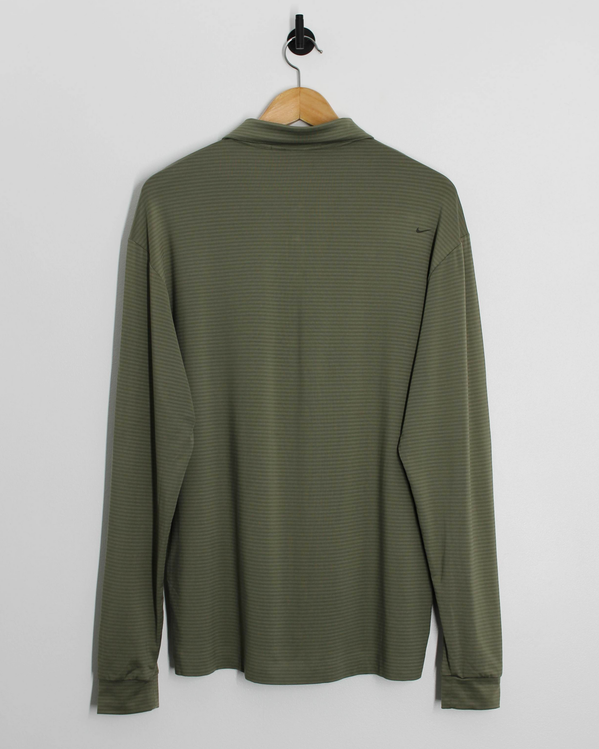A refined Tiger Woods-era Nike long-sleeve polo in deep olive green, finished with subtle horizontal striping that reads clean and technical up close. Cut in a relaxed, athletic silhouette with a soft spread collar and four-button placket, it balances course-ready performance with understated style. Lightweight and breathable with a smooth drape, this piece reflects Nike Golf’s early-2000s design language - minimal branding, premium fabric, and quiet confidence. Ideal worn solo or layered, on or off the fairway.