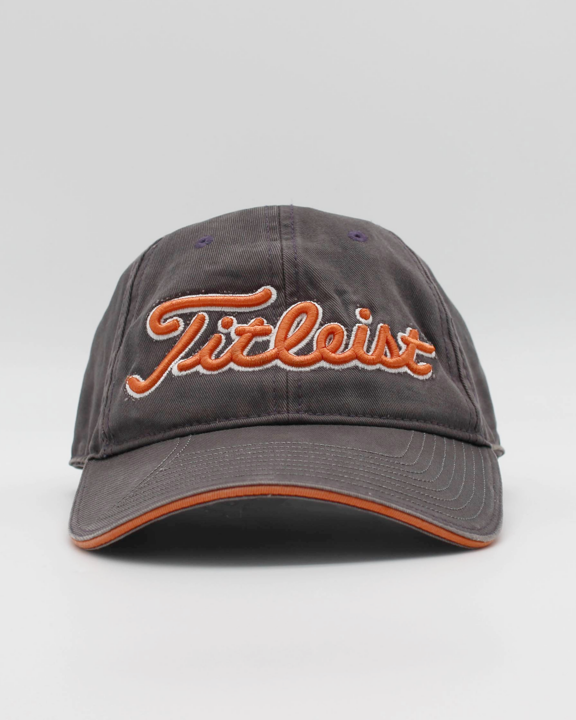 A washed charcoal-grey cotton cap with bold orange Titleist embroidery across the front and matching logo detail at the back. Designed by New Era, it features a pre-curved brim with orange edging and a metal clasp closure for an adjustable fit. The relaxed six-panel construction gives it an easy, broken-in feel that works on or off the course. Finished with tonal stitching and a low-profile silhouette that sits comfortably through long rounds or casual wear.